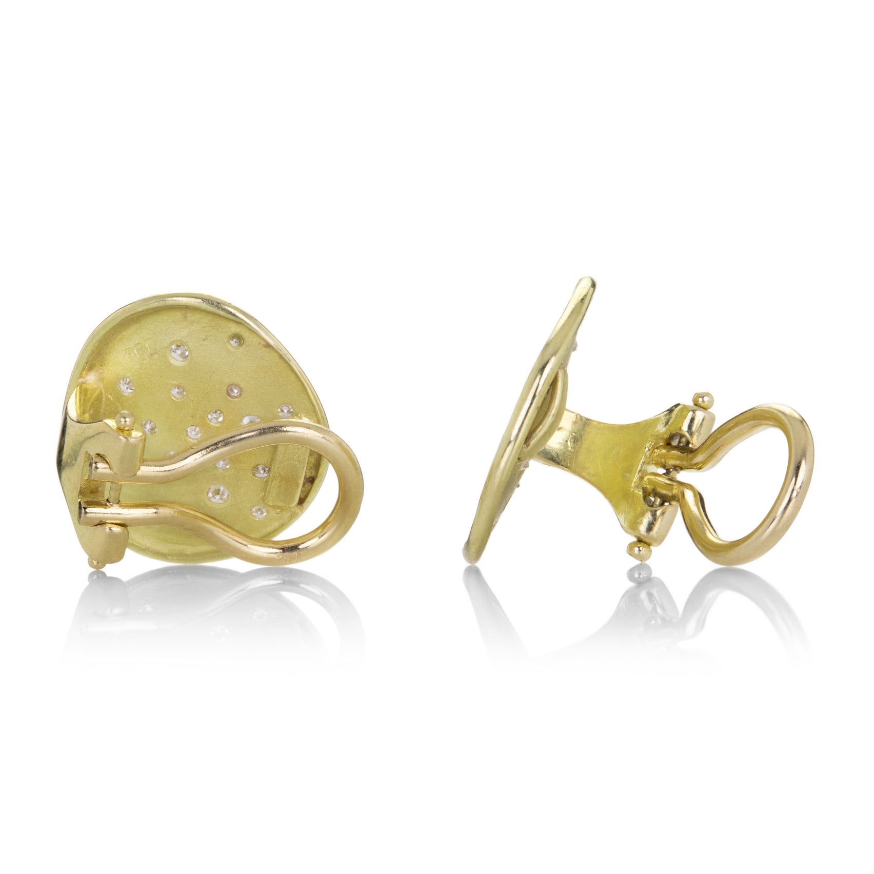 At the intersection of fire and ice, this pair of 18k yellow gold clip-on earrings from Barbara Heinrich dazzles! Organically formed carved glacier faces feature 32 scattered surface set white diamonds totaling 0.20cttw. Earrings measure 1/2" wide. Perfect for sensitive or non-pierced ears. Handcrafted in Rochester, NY, U.S.