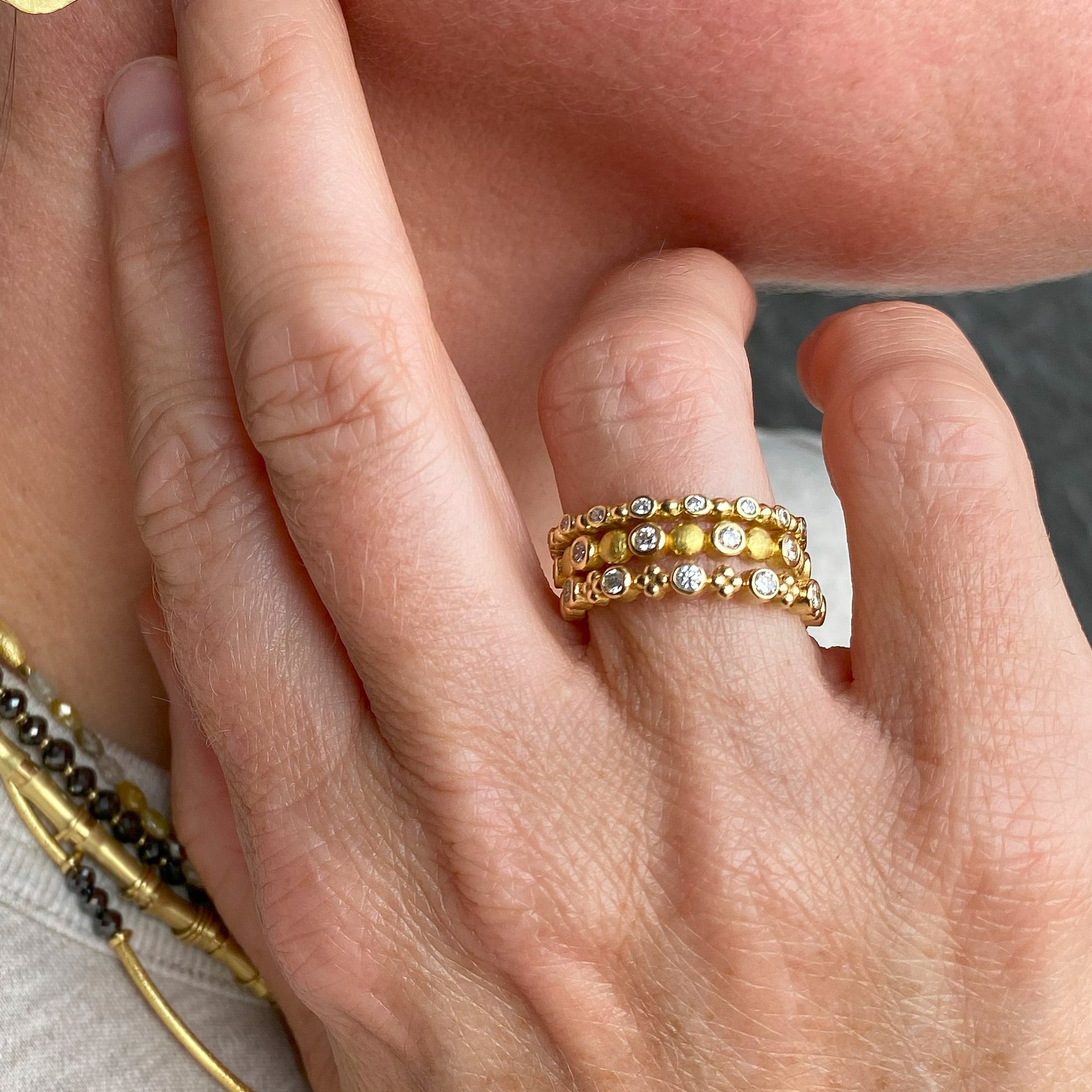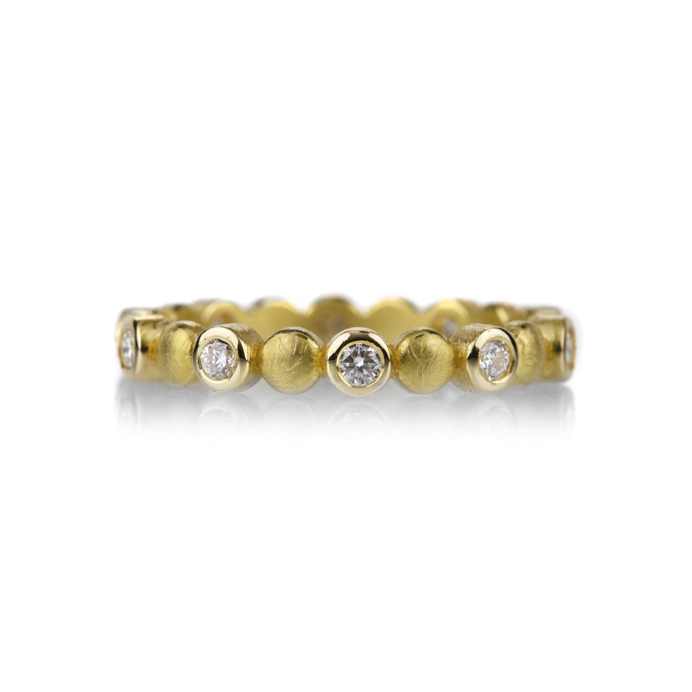 For the best in stacking rings, Barbara Heinrich provides a wide selection to suit every style. This 18k yellow gold band is finely detailed with flat round bubbles interspersed with sixteen bezel set white diamonds totaling 0.32cttw. Size 6.5. Handcrafted in Rochester, NY, U.S.