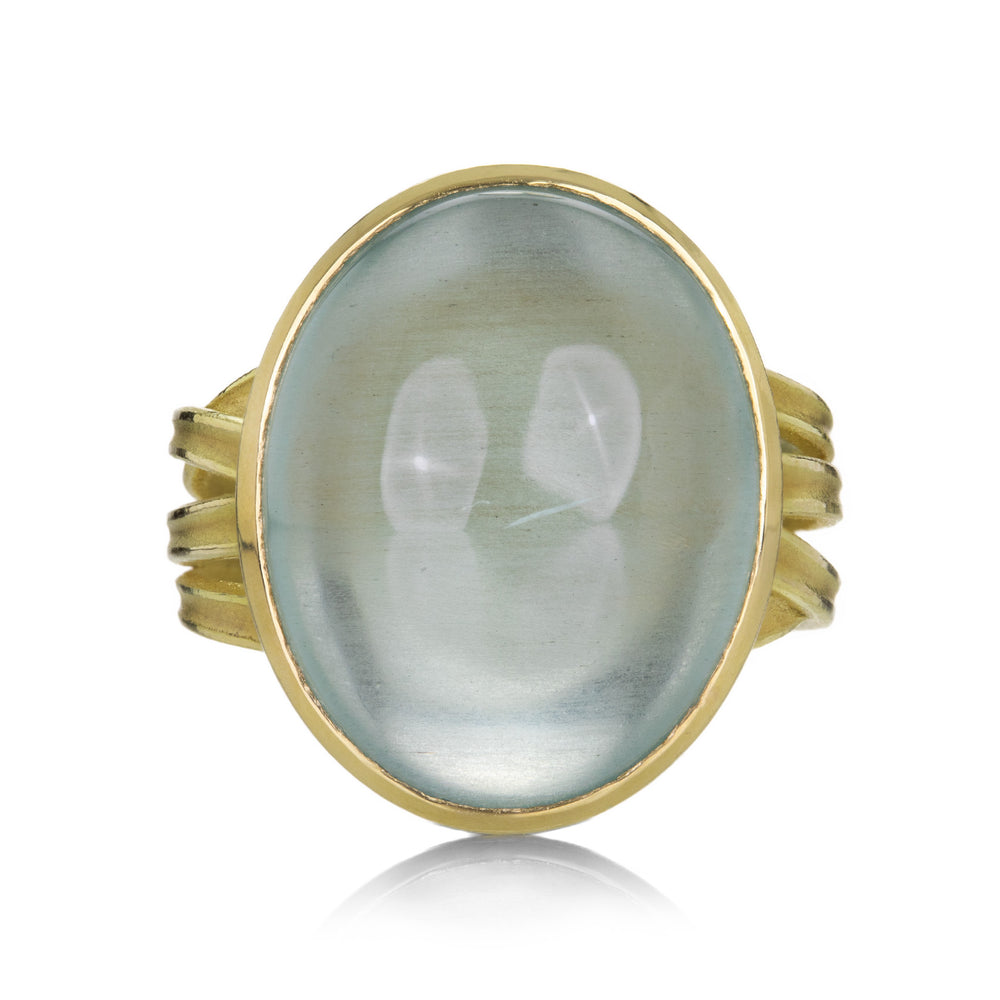 With four flowing ribbons of 18k yellow gold encircling a 15.79ct oval aquamarine cabochon, this Barbara Heinrich ring is a poetic ode to the ocean. The stone is as mysterious and deep as the water its name honors. Size 7.75. Handcrafted in Rochester, NY, U.S.