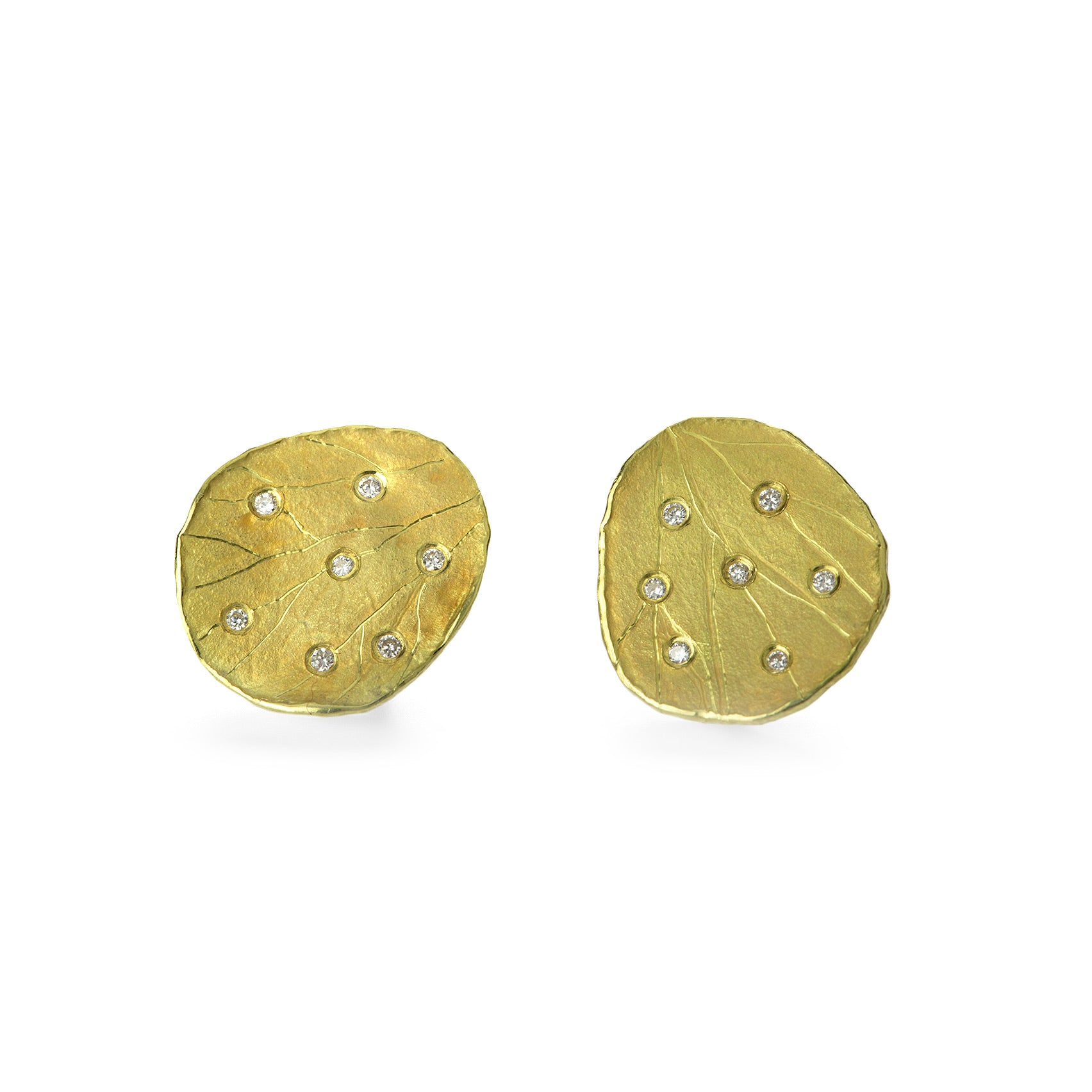 Drawing inspiration from a favorite summer bloom, Barbara Heinrich brings us this pair of 18k yellow gold petal studs. Each lovingly textured petal features a silky, brushed look with fourteen scattered diamonds totaling 0.07cttw for dewy sparkle. This pair is the perfect complement to any look, from casual to cocktails! Studs measure approximately 1/2" in diameter. Handcrafted in Rochester, NY, U.S.