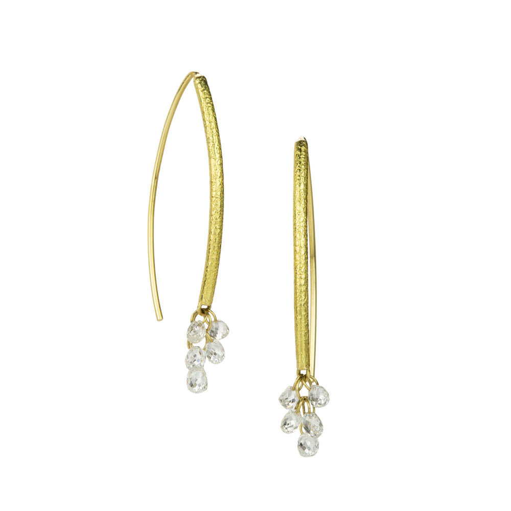 This pair of Barbara Heinrich diamond earrings features a dramatic navette form and soft, shimmering sparkle. Crafted in textured 18k yellow gold, elongated wires hold ten faceted white diamond briolettes totaling 1.27cttw. Just the right hit of spark to keep the flame alive! Total length measures 1 3/8". Handcrafted in Rochester, NY, U.S.