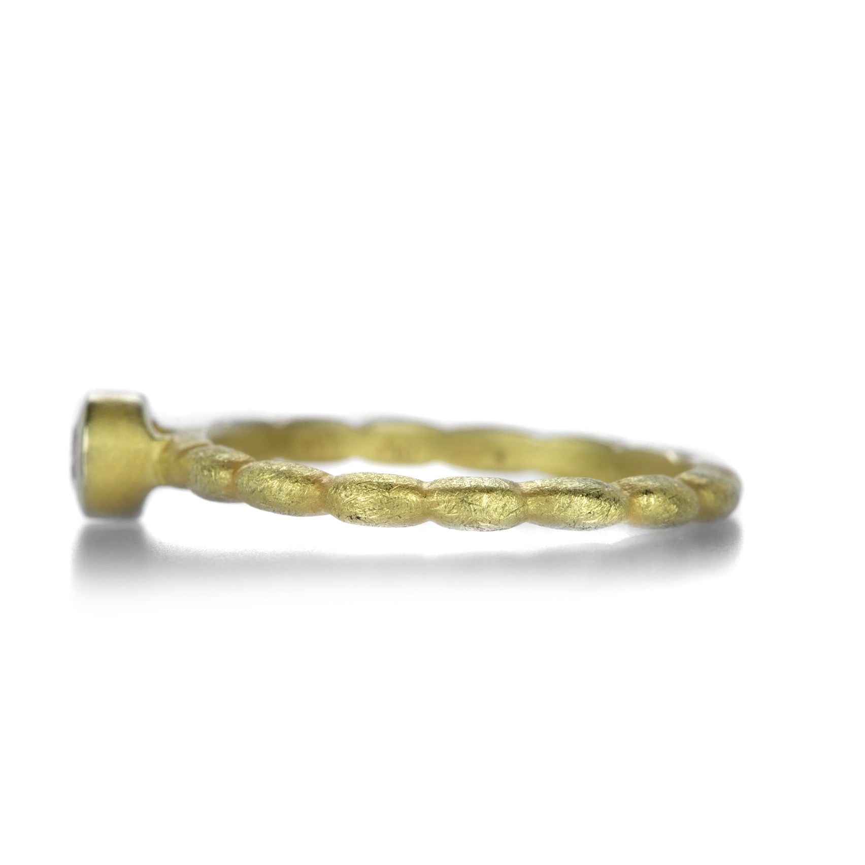 Say yes to this refined, understated symbol of forever from Barbara Heinrich. Crafted in 18k yellow gold, this stackable engagement ring features charming pillow band detailing and a sparkling bezel set round, 0.18ct 3.5mm diamond. Size 7. Handcrafted in Rochester, NY, U.S.