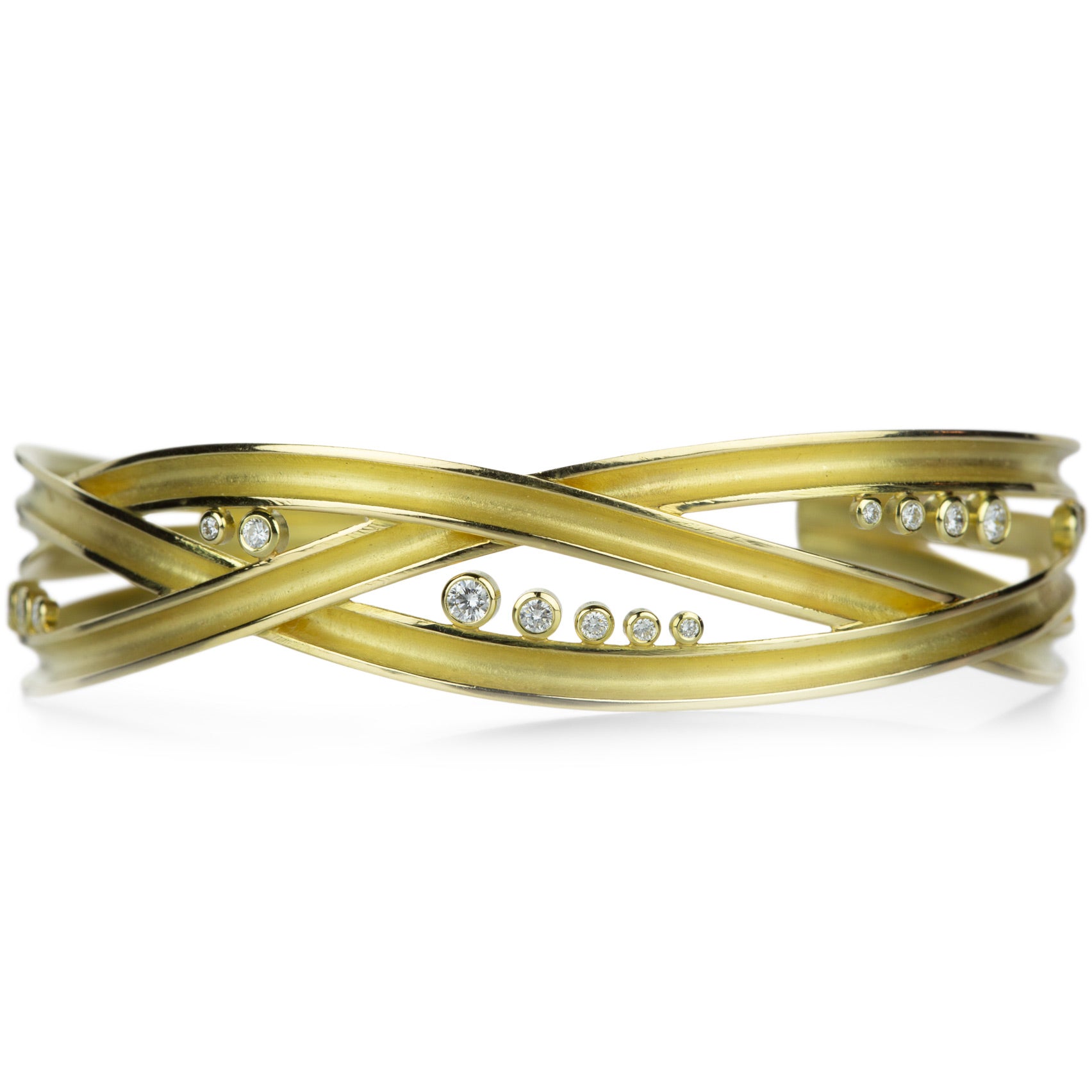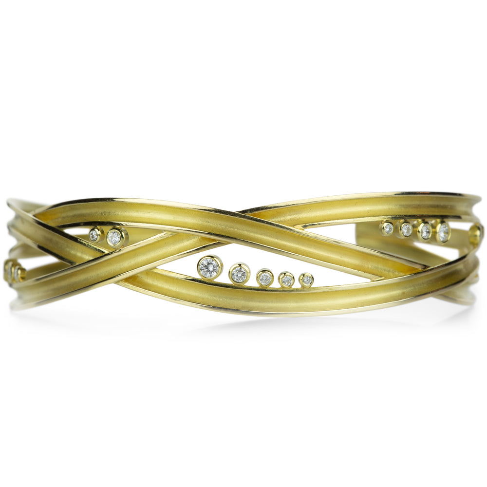 Wrap yourself in the sheer luxury of Barbara Heinrich’s brushed gold ribbons. This 18k yellow gold three ribbon open cuff will remind you of the very gift that you are to this world. Scattered bezel set diamonds totaling 0.36cttw add the magic! Cuff measures 1/2" wide. Inner diameter measures 2 3/8" 1 7/8". Handcrafted in Rochester, NY, U.S.