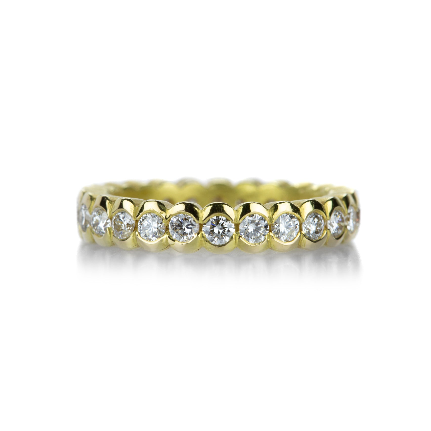 The quintessential stacking ring, an eternity band is a must have staple in every jewelry box. This 18k yellow gold ring from Barbara Heinrich features twenty six white diamonds totaling 1.31cttw. The smooth, rounded edges add a fine, comfortable feel to the design. Size 6.75. Handcrafted in Rochester, NY, U.S.
