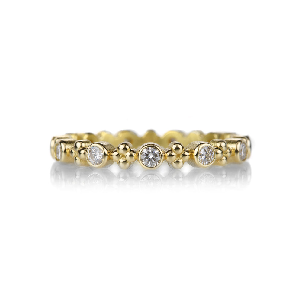 For the best in stacking rings, Barbara Heinrich provides a wide selection to suit every style. This 18k yellow band is finely detailed with quad beaded granules interspersed with eleven bezel set white diamonds totaling 0.44cttw. Size 7. Handcrafted in Rochester, NY, U.S.