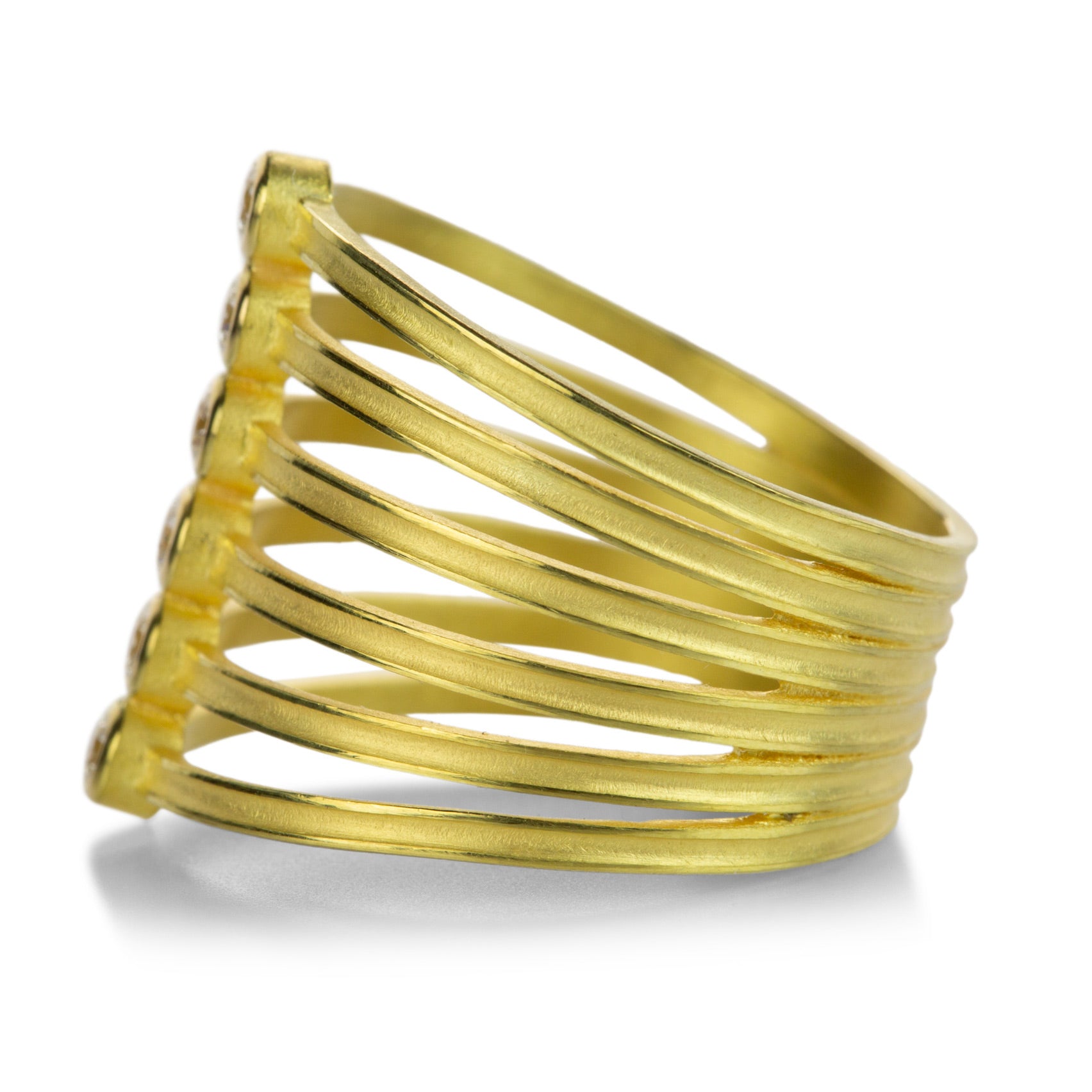 Stack up the luxury with one effortless piece from Barbara Heinrich . This 18k yellow gold zipper ring shines bright with six squared bands, each with its own bezel set diamond, all totaling 0.27cttw. What could this beauty represent for you? Band width measures 5/8" in the front and tapers down to just over 1/4” wide in the back. Size 7.5. Handcrafted in Rochester, NY, U.S.