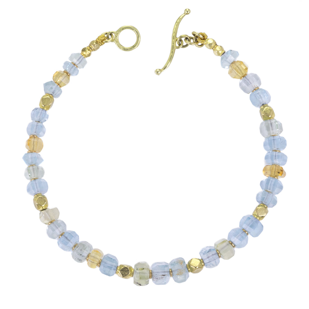 A dazzling dressing for your wrist when stacked or worn solo, this 18k yellow gold bracelet from Barbara Heinrich sparkles with faceted aquamarine and beryl rondelle beads totaling 16.48cttw. Faceted gold bead spacers are interspersed throughout. Total length with toggle clasp measures 7 1/4“. Handcrafted in Rochester, NY, U.S.