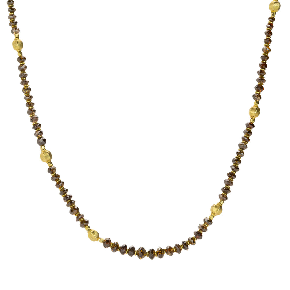 Bask in the beaded bliss of this dazzling 18k yellow gold necklace from Barbara Heinrich. Natural faceted brown diamond beads totaling 24.30cttw are interspersed with round gold station spacers and tiny jump rings. This artistically arranged piece is subtle, yet full of sparkle! Total length measures 16 1/2” with a 1" extension chain. Handcrafted in Rochester, NY, U.S.