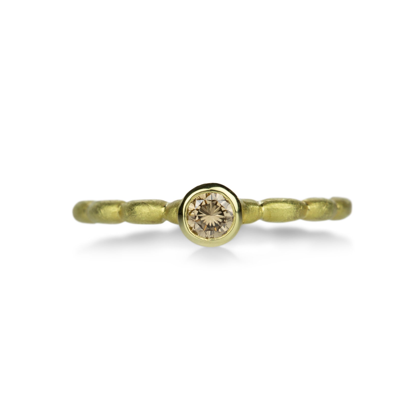 Add an earthy elegance to your stack, or consider an alternate engagement choice in this 18k yellow gold ring from Barbara Heinrich. A brushed pillow shank band holds a round 0.20ct brown diamond set in a polished bezel. Stone measures 1/8" in diameter. Size 6.5. Handcrafted in Rochester, NY, U.S.