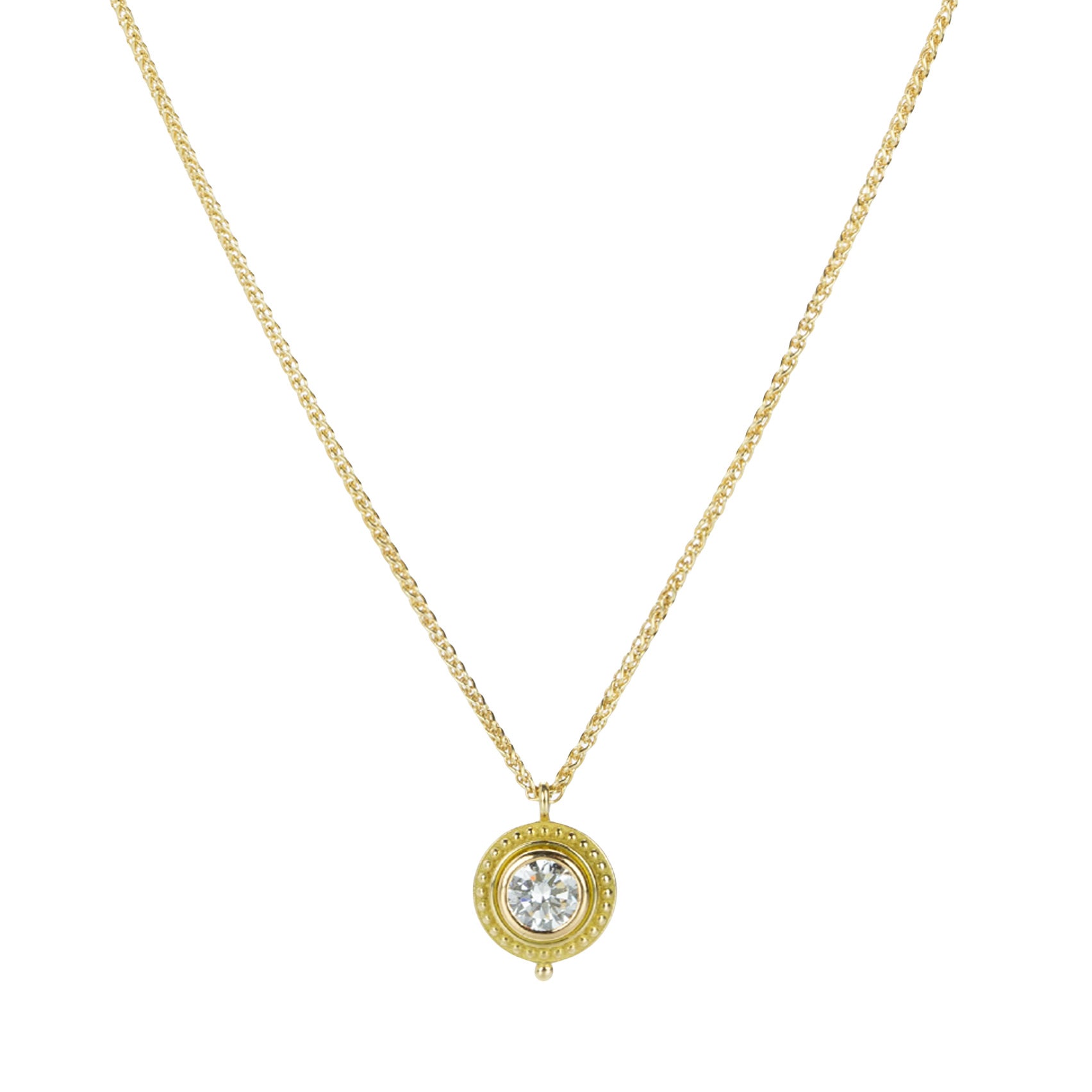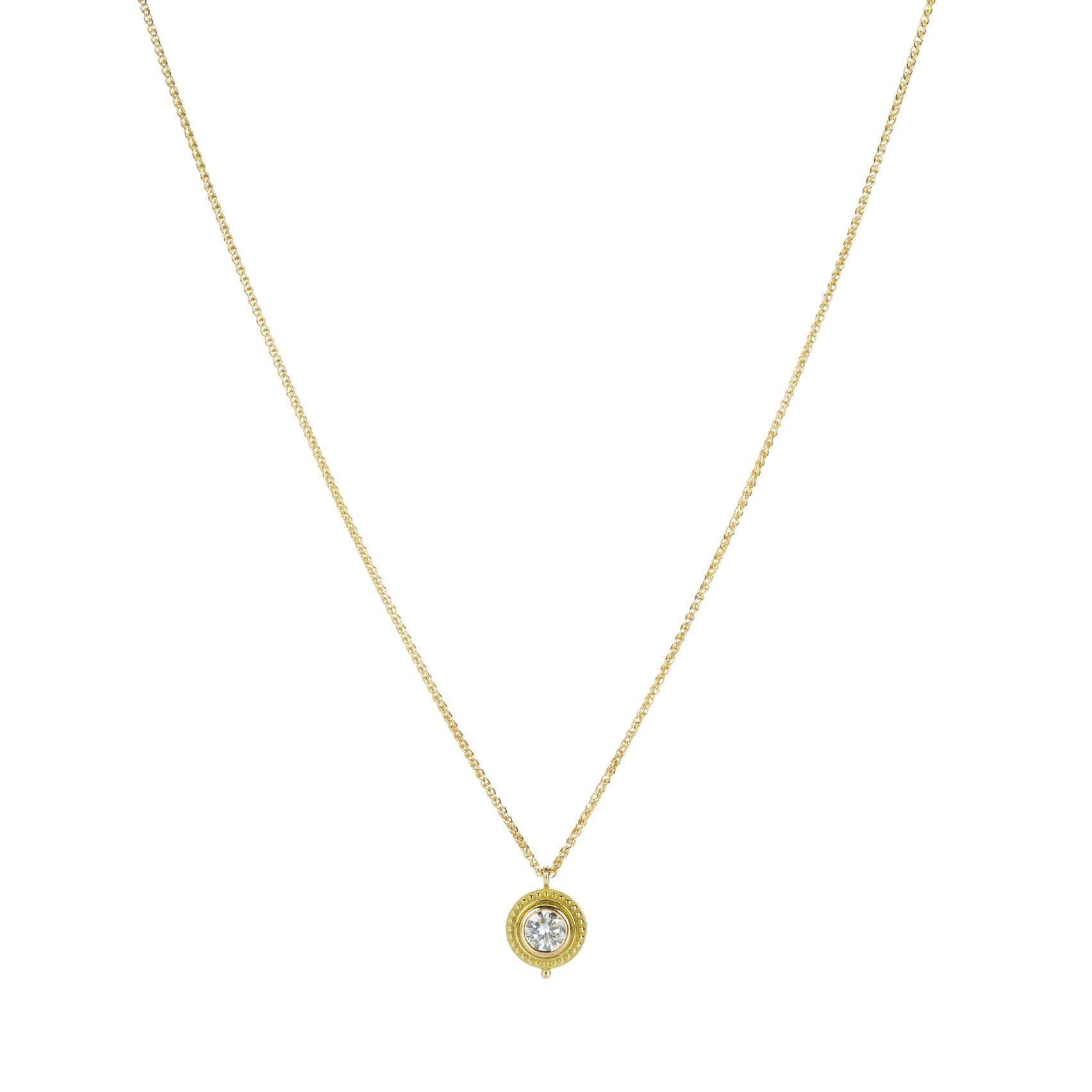 A perfect piece for every day, this diamond solitaire necklace from Barbara Heinrich would make a most charming gift for any occasion. A 0.39ct round diamond is set in a decorative granulated bezel in 18k yellow gold. Show your eternal love with this elegant, meaningful piece. Pendant measures 1/2” in diameter. Total spiga chain length measures 17". Handcrafted in Rochester, NY, U.S.