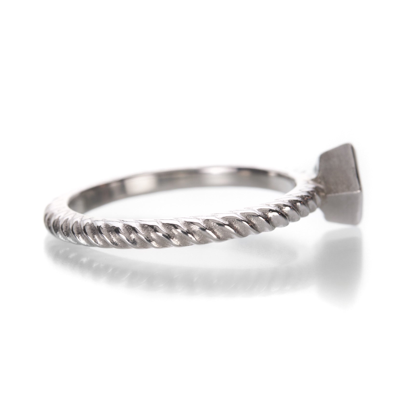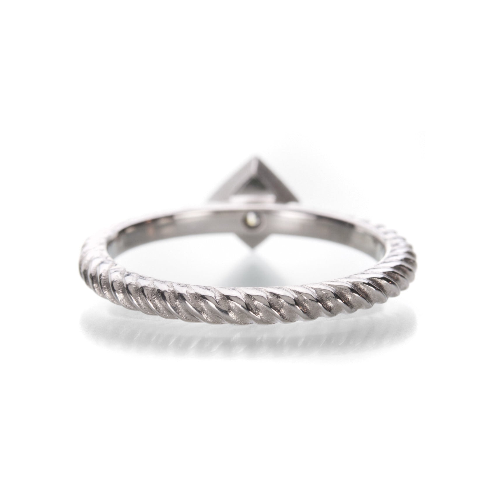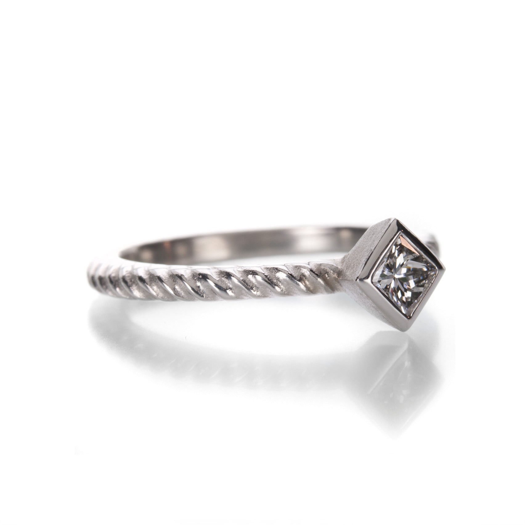 This platinum ring from Barbara Heinrich features a dazzling, bezel set 0.32ct square G/VS diamond. The sparkling stone sits on a twisted shank, highlighted by its luxurious texture. Place it in between two diamond bands or other textured rings for a stunning stack! Stone measures about 4.8mm x 4.8mm. Size 6.5. Handcrafted in Rochester, NY, U.S.