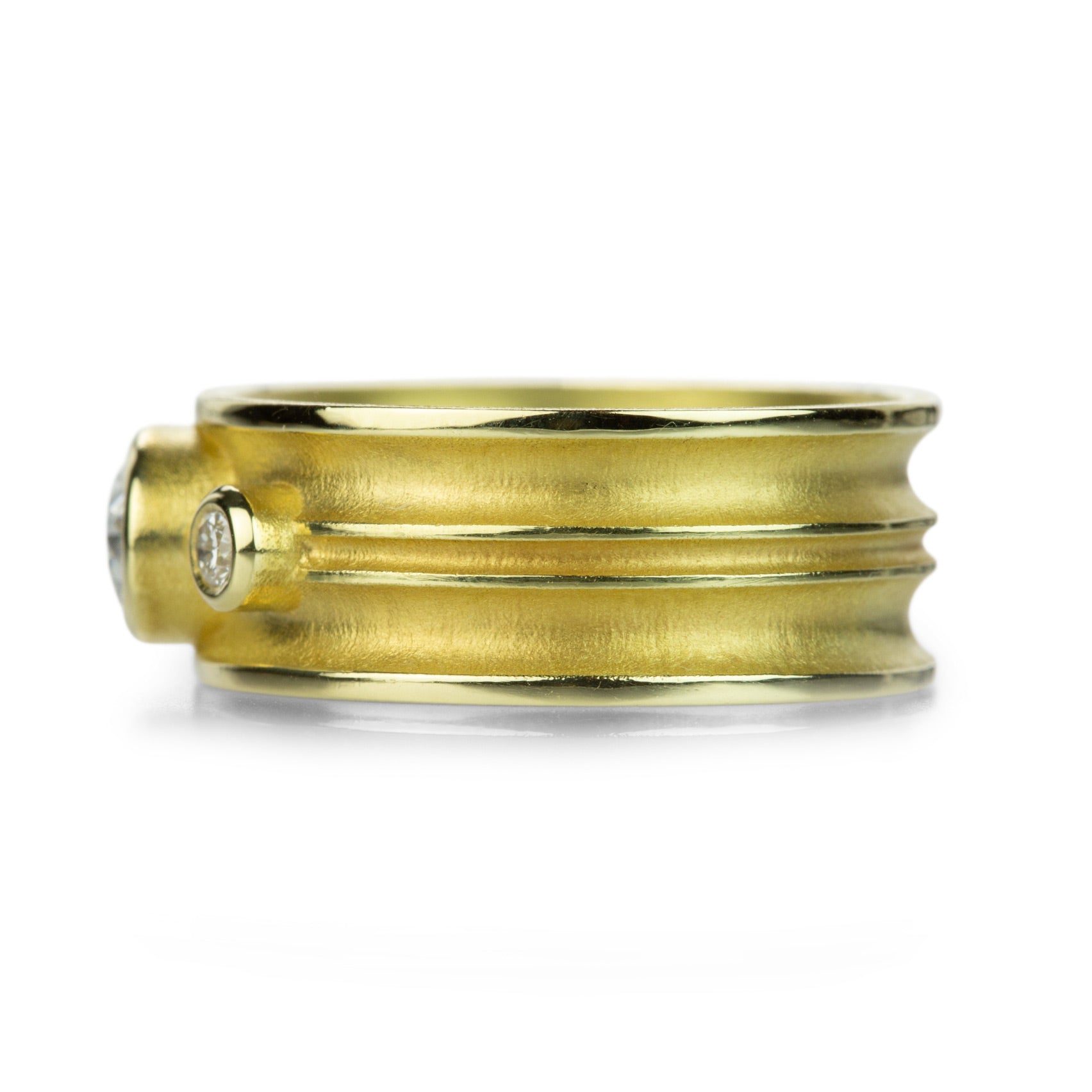 This 18k yellow gold ring from Barbara Heinrich features a wonderful trio of stones on a double wide-fluted band. The oval 0.75ct diamond is bezel set with round side diamonds totaling 0.12ctw. This ring makes a statement with sparkle and a blend of brushed and polished finishes. Size 7.5. Handcrafted in Rochester, NY, U.S.