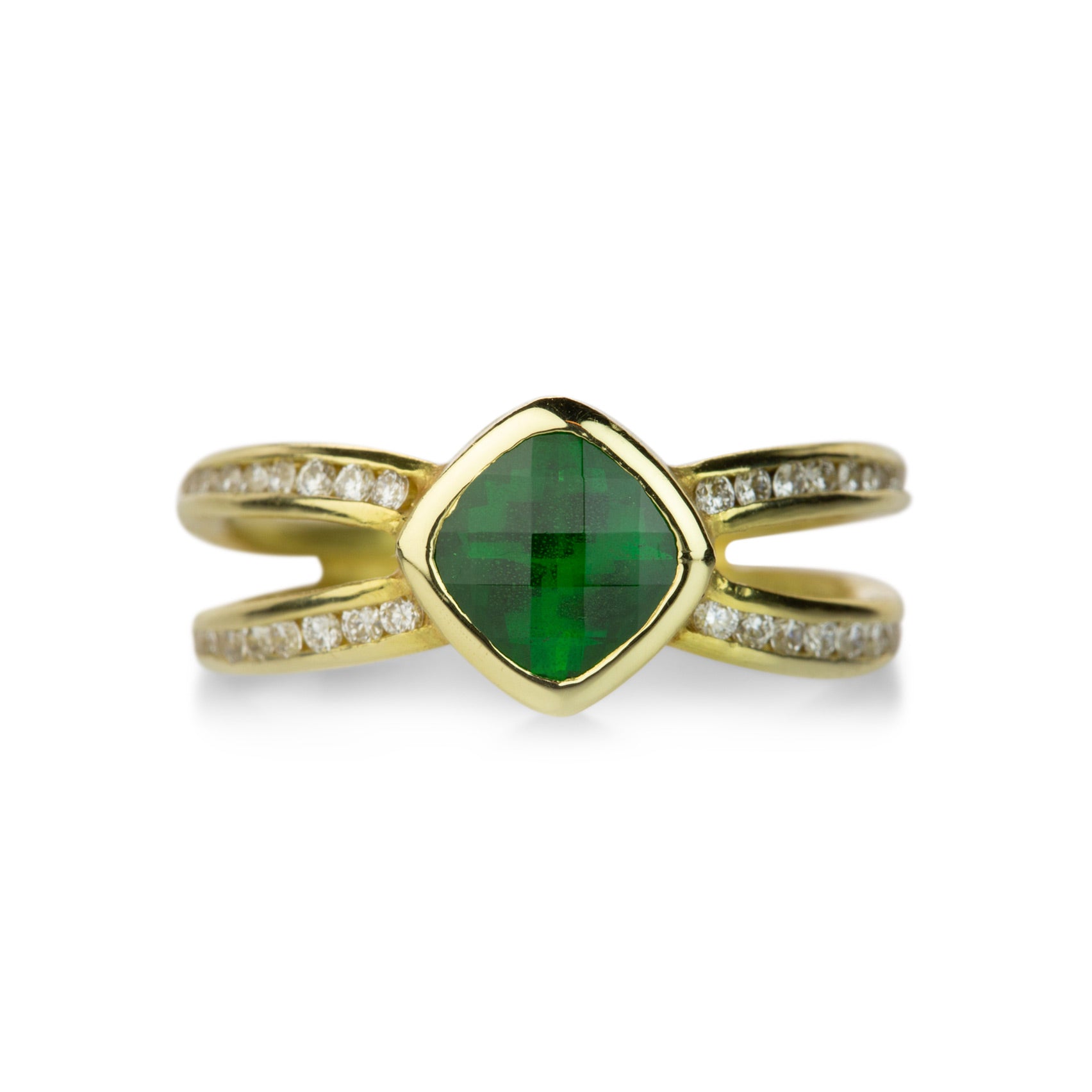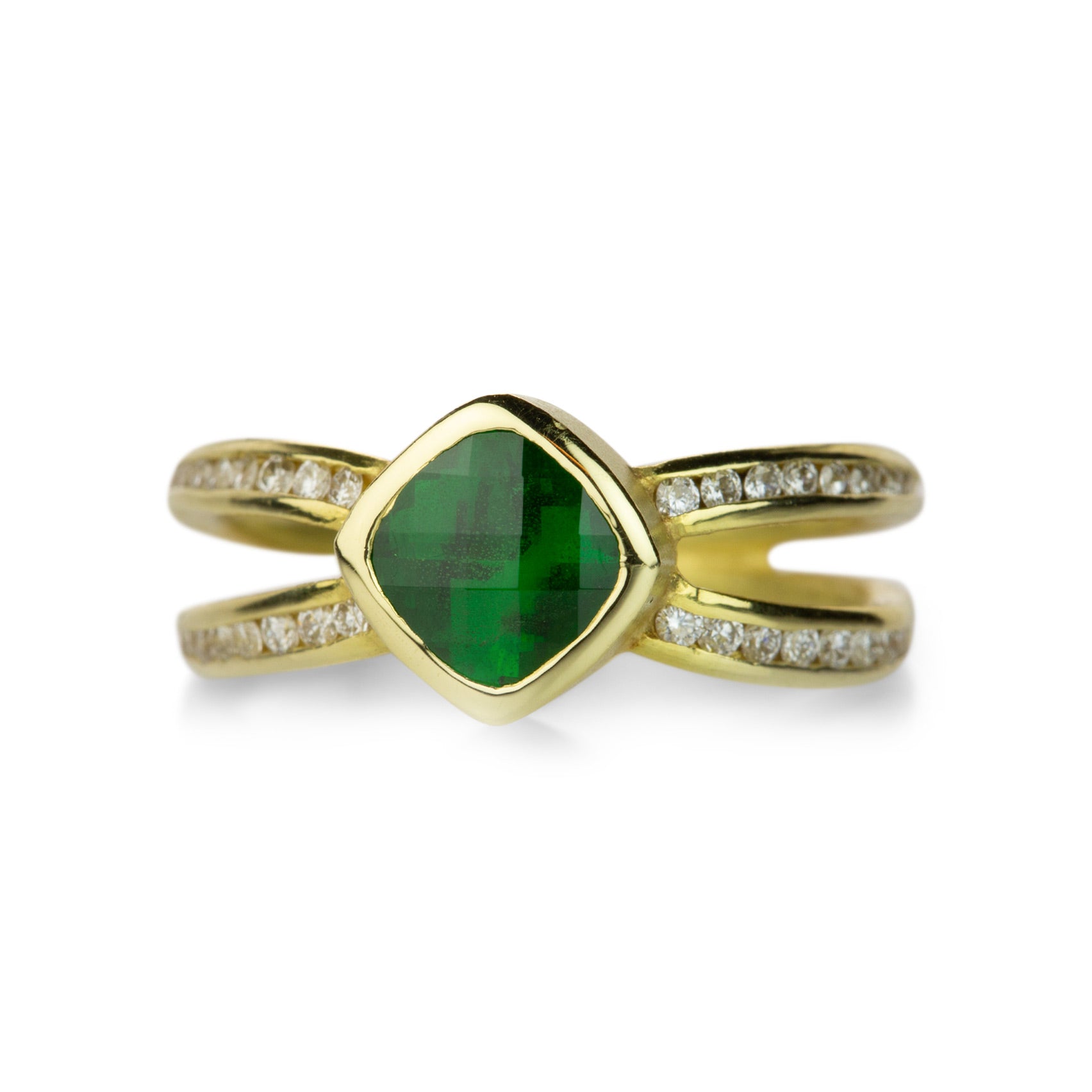 Come to your senses and allow this 18k yellow gold Barbara Heinrich ring to take hold! A 1.31ct cushion cut tsavorite garnet forms the nexus, grounded to a crisscross beveled band. White diamonds totaling 0.29cttw add fiery sparkle to the magnificent green stone. Size 8.25. Handcrafted in Rochester, NY, U.S.