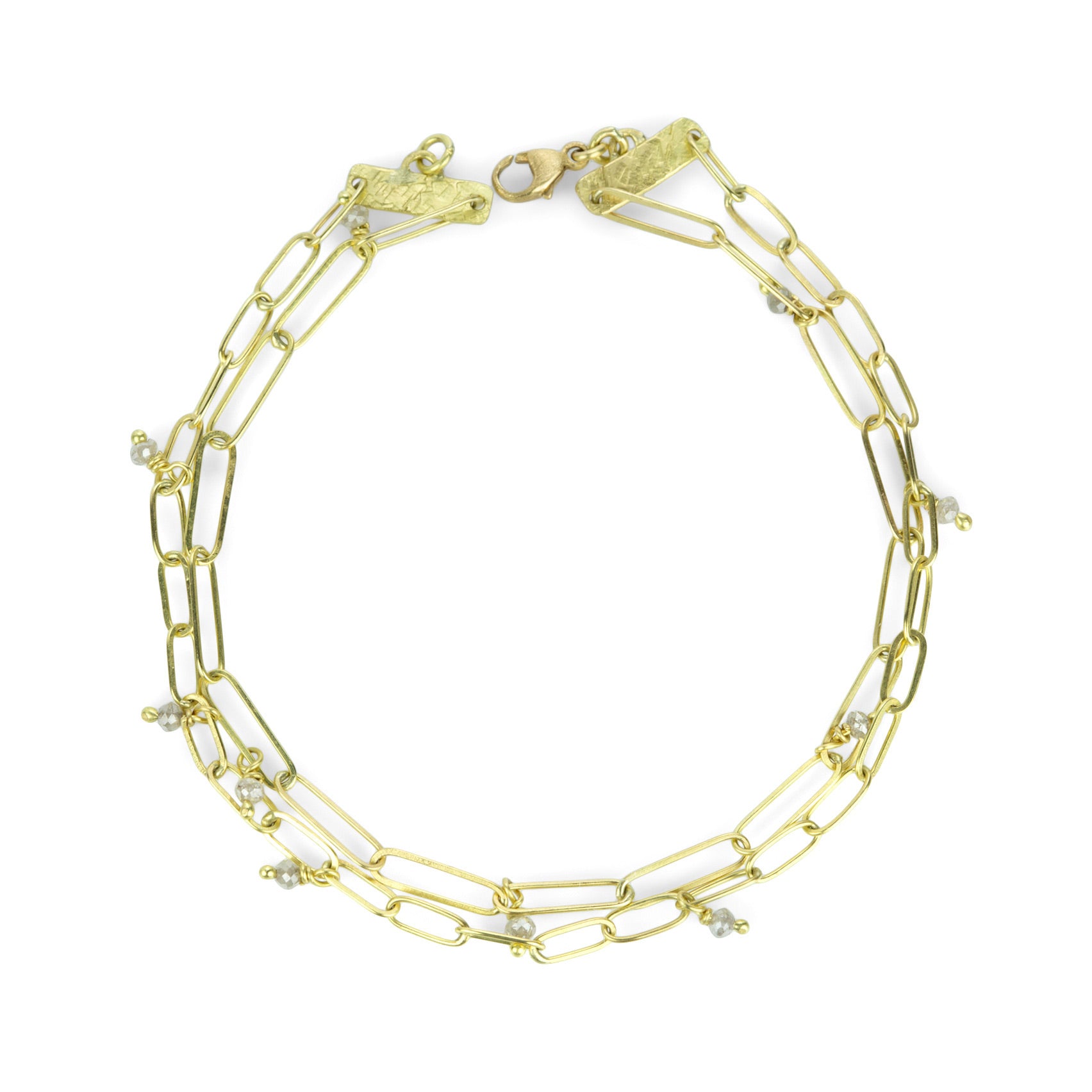 Layer on the links in this 18k yellow gold double popsicle chain bracelet from Lene Vibe. Faceted gray diamond beads twinkle and chime at various hand formed links. Total length with lobster clasp measures 7". Handcrafted in Denmark.