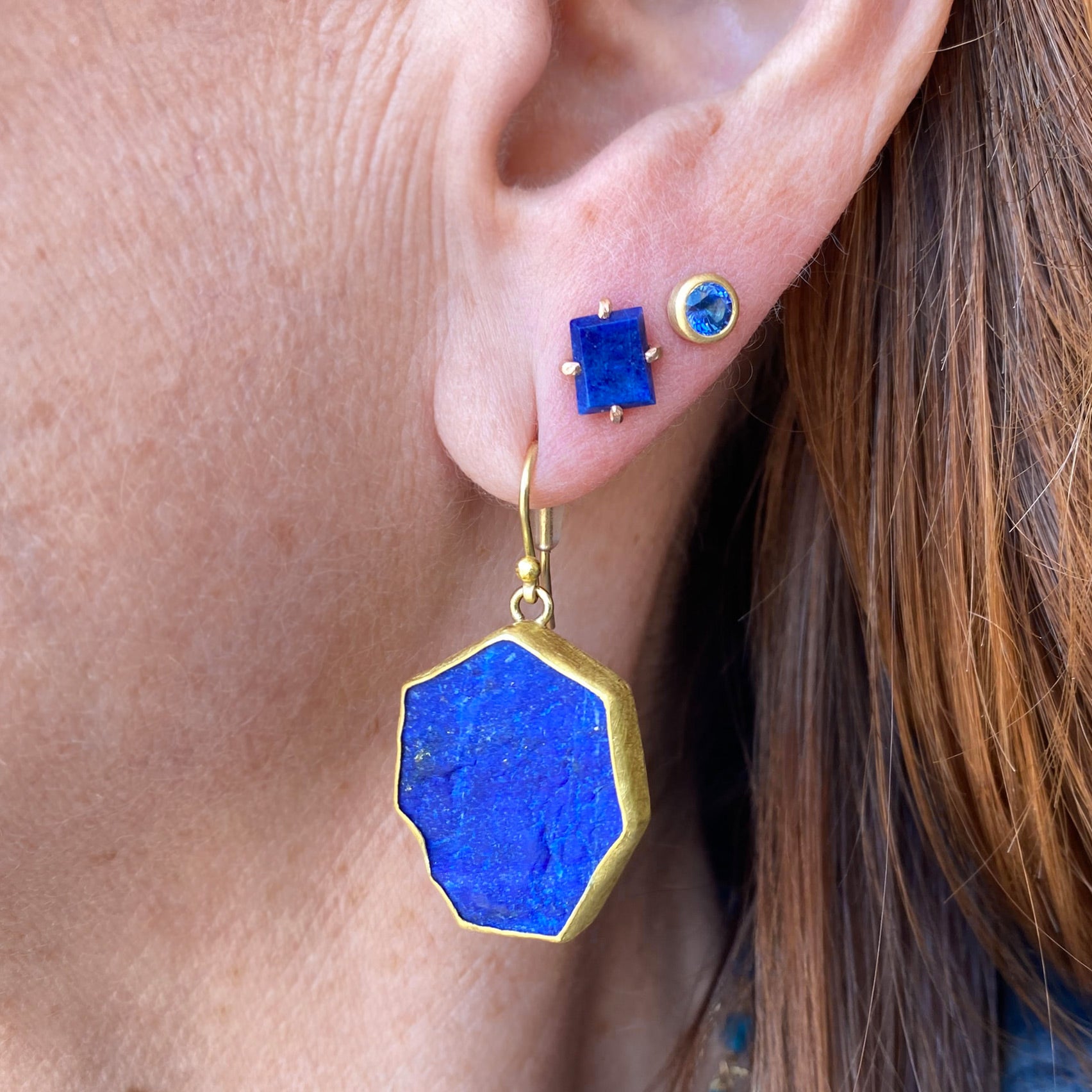 Gaze deeply into the blue in this pair of 18k yellow gold earrings from Petra Class. Rough cut lapis polygonal drops are set in 22k yellow gold bezels. Total length with curved ear wires measures 1 1/2”. Handcrafted in San Francisco, CA, U.S.