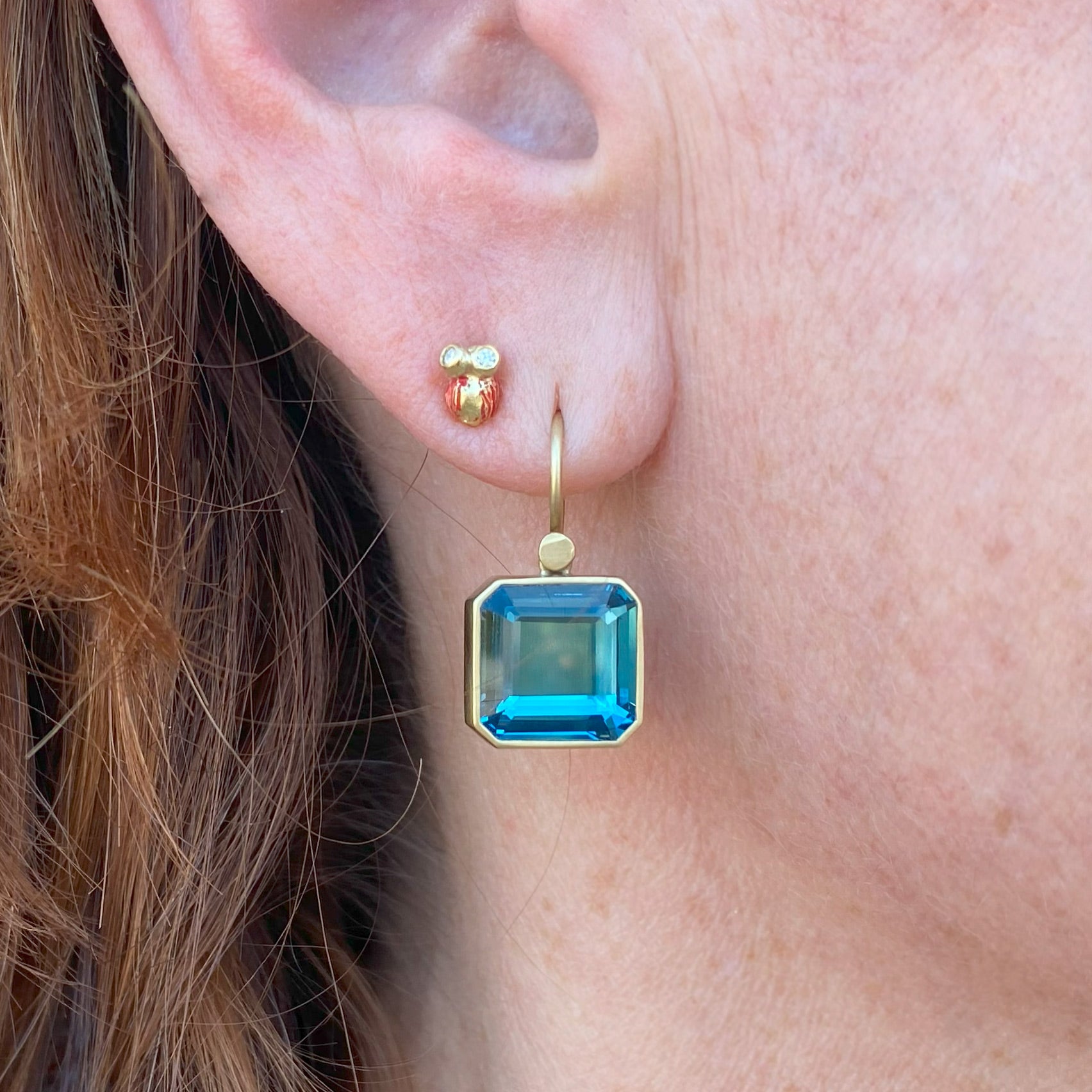 Wade into windows of true blue bliss! This pair of 18k yellow gold earrings from Lola Brooks glints and gleams with octagonal London blue topaz drops totaling 12.11cttw. Set in satiny brushed 18k yellow gold bezels and hanging from dot detailed ear wires, the total length measures 7/8”. Handcrafted in Lexington, GA, U.S.