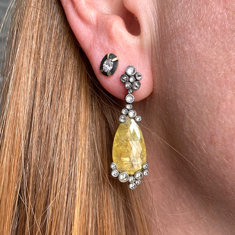Glowing with rough-luxe opulence, this pair of darkened 14k white gold earrings from Todd Pownell is a delight for the senses! At the 18k yellow gold posts lay rugged bezel set inverted diamond clusters totaling 1.71cttw, dripping down towards faceted pear shaped yellow diamonds totaling 14.0cttw, seemingly afloat in a sparkling sea. Total length measures just over 1 1/4“. Handcrafted in Cleveland, OH, U.S.
