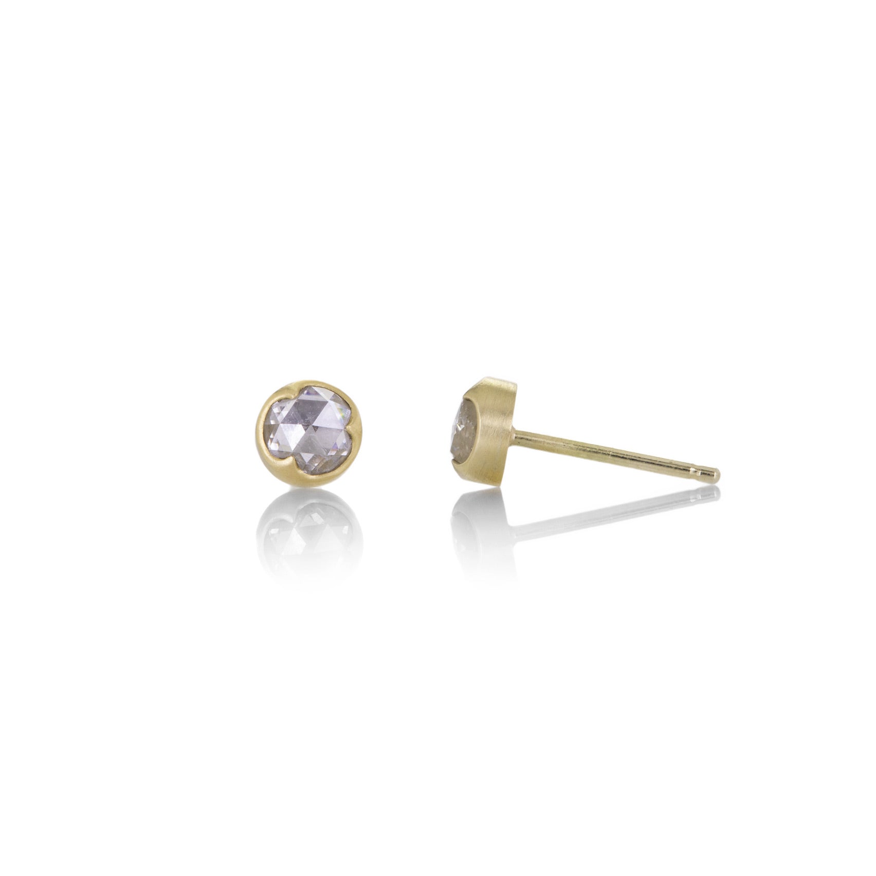 These perfectly petite 18k yellow gold studs from Gabriella Kiss tick all the right boxes! Set in the artist’s signature scalloped bezels, sparkling rose cut round white diamonds totaling 1.0cttw possess a generous beauty. Studs measure just under 1/4” in diameter. Handcrafted in Hudson Valley, NY, U.S.