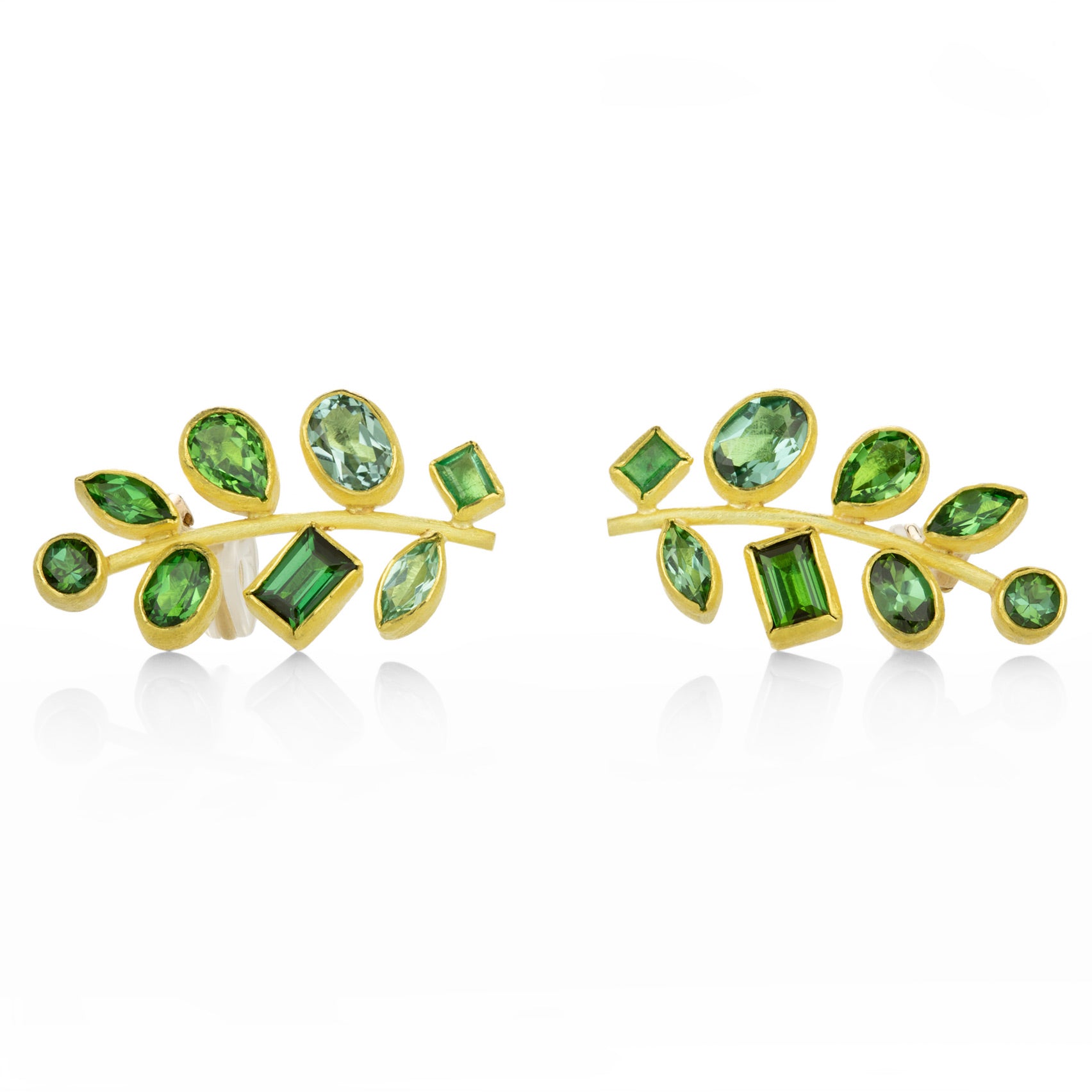 Take a sweet, juicy bite out of life in this sumptuous pair of posted stud earrings from Petra Class. 22k yellow gold bezel set green tourmalines of various shapes and sizes gracefully climb the vine. With 18k yellow gold posts, earrings measure just under 1 1/4“ x 5/8“. Handcrafted in San Francisco, CA, U.S.