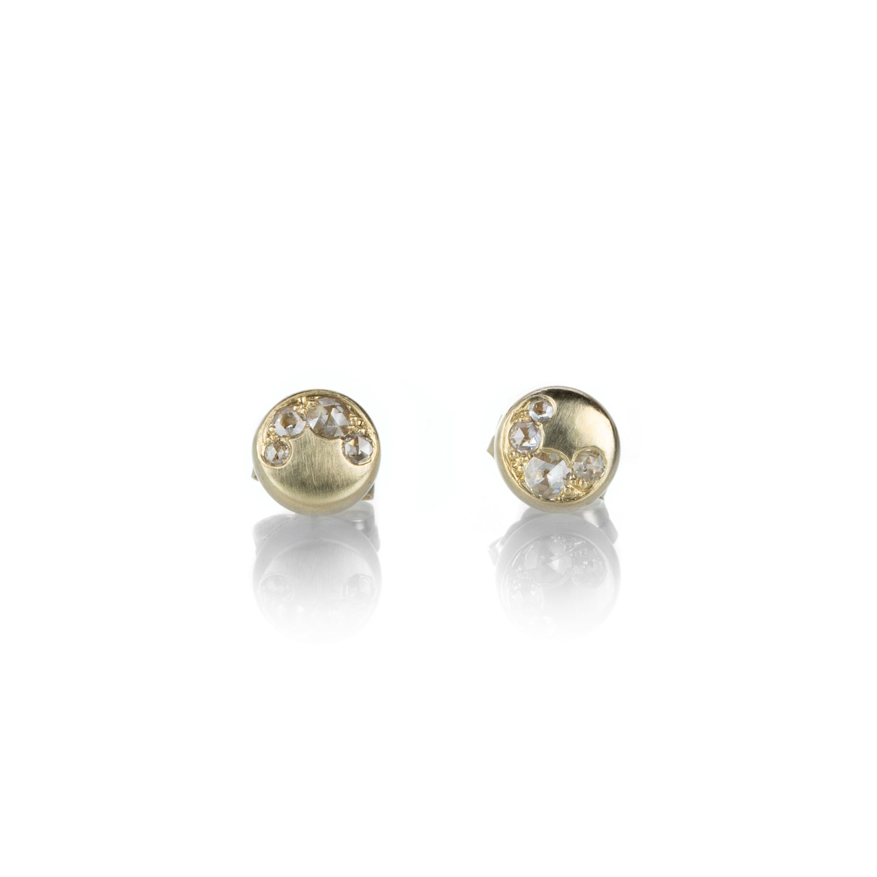Glitter like the starlight in the snow in this pair of small studs from Nicole Landaw. These brushed round studs feature ethereal rose cut diamonds totaling 0.08cttw. Diameter measures just under 1/4”. Handcrafted in Hudson River Valley, NY, U.S.