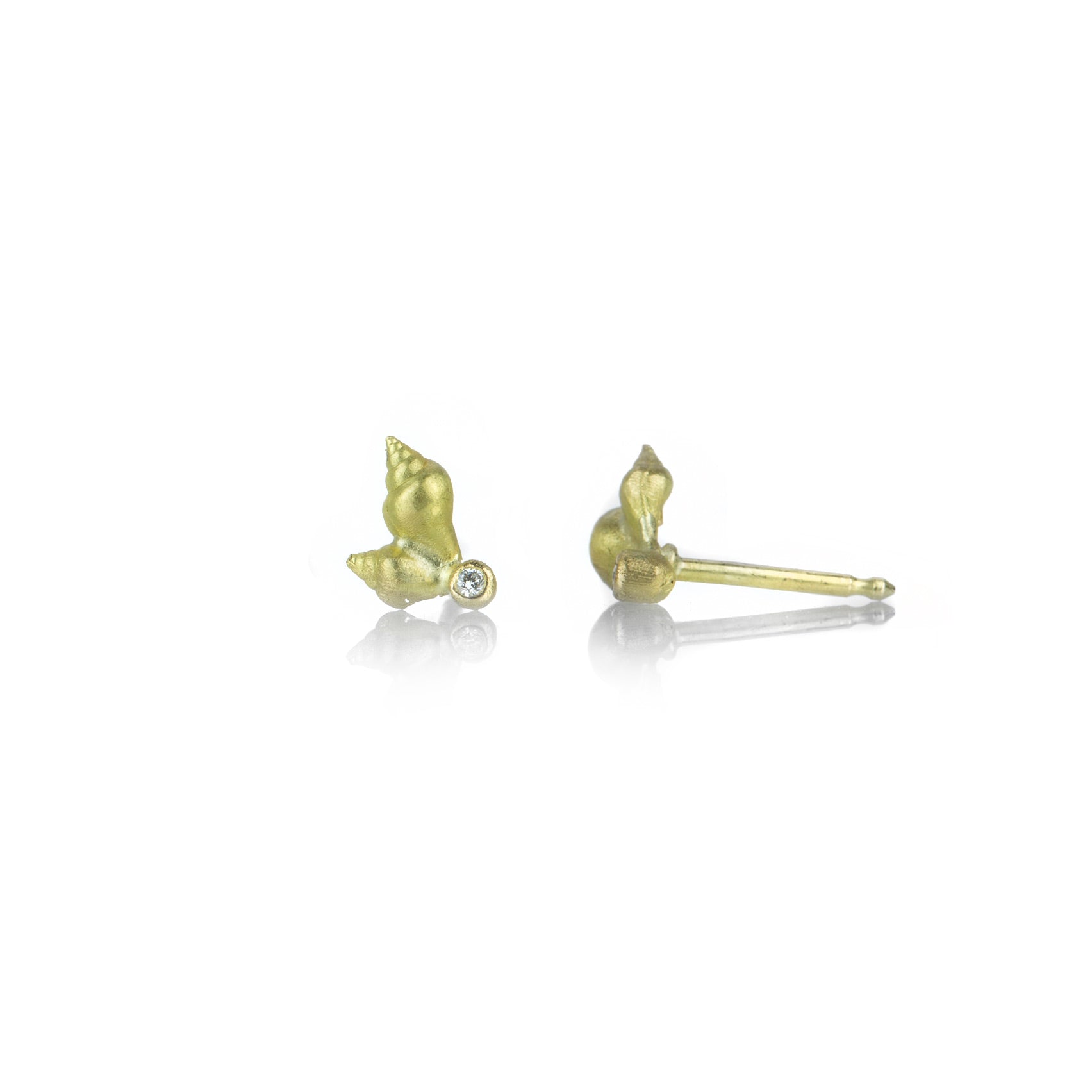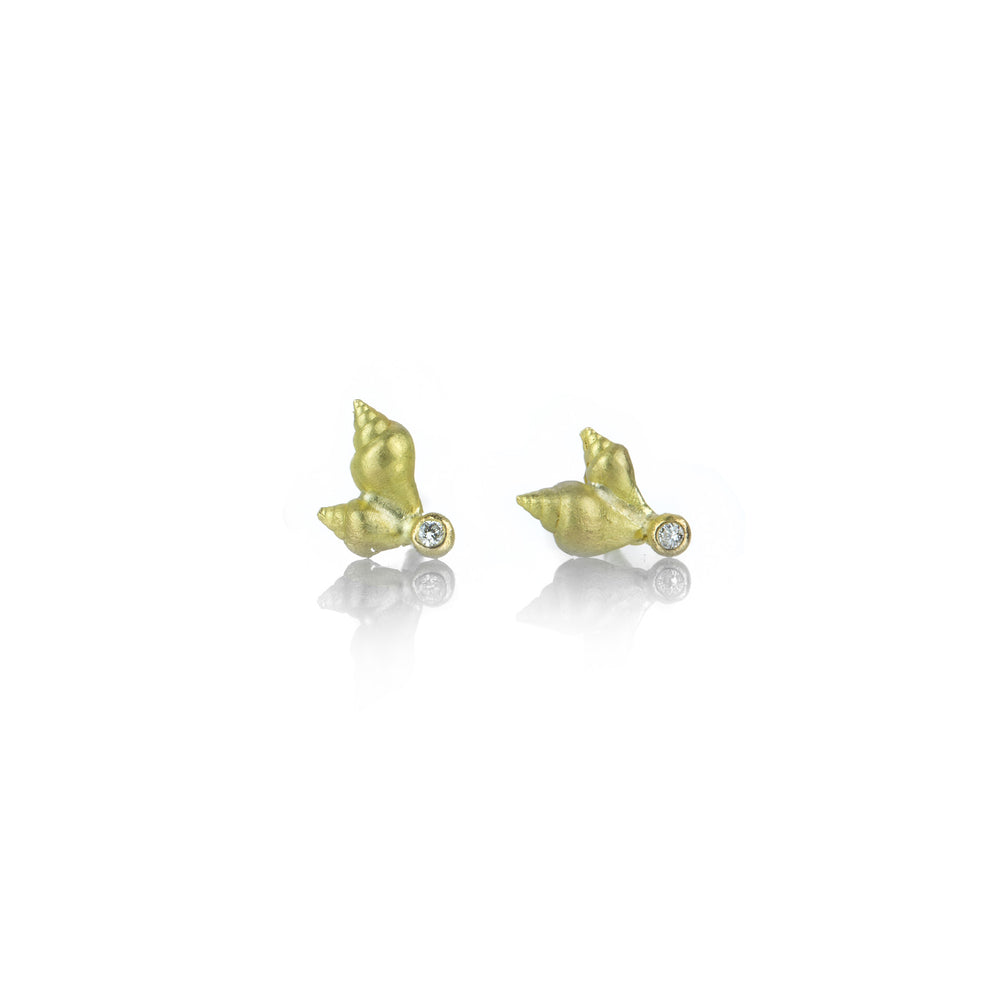 Mermaid magic is the vibe in this pair of 18k yellow gold studs from Lene Vibe. Each stud features two impossibly tiny, detailed shells with a single, 0.01ct white diamond, taking your ear party to new mysterious depths. Studs measure just over 1/4” x 1/4”. Handcrafted in Denmark.