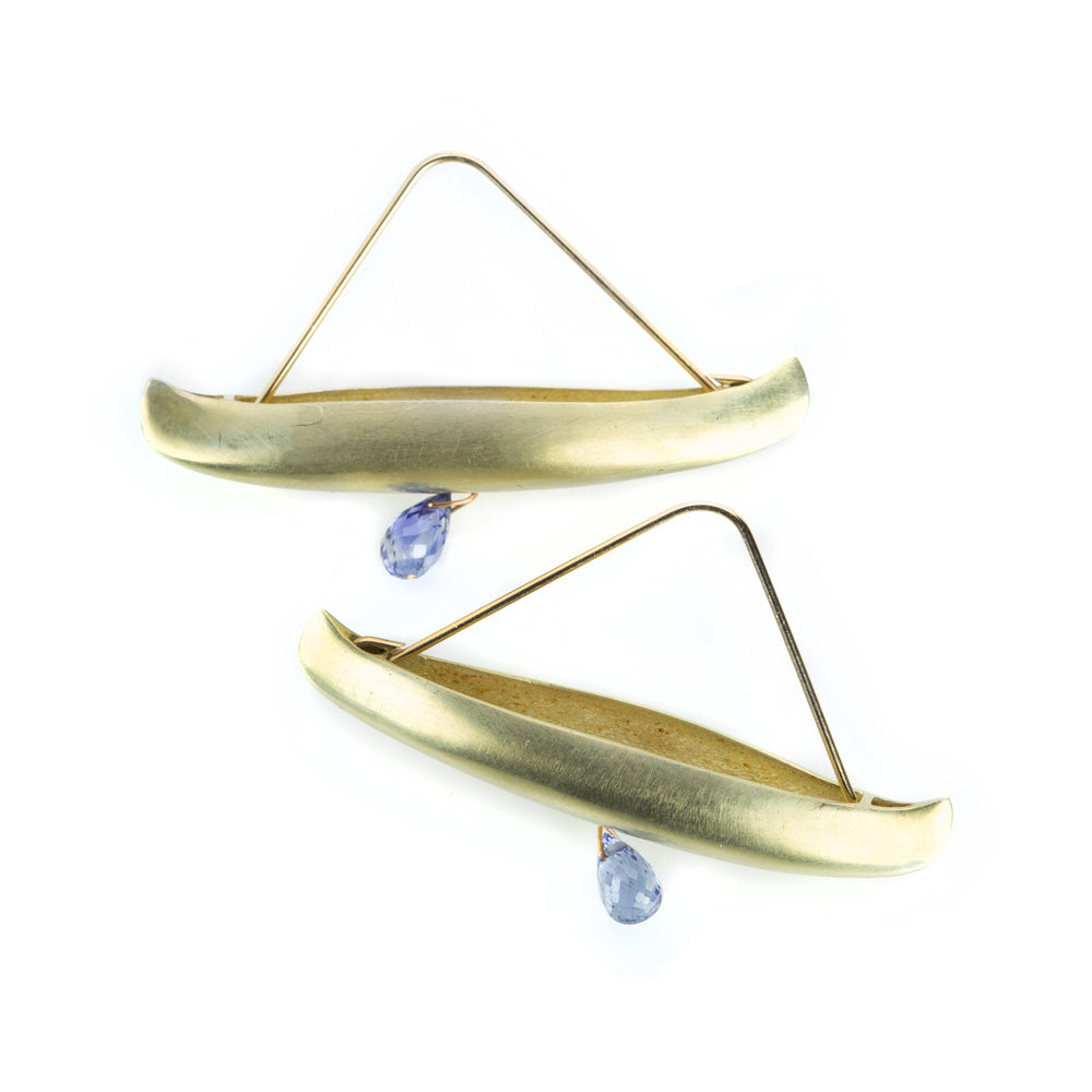 Alluring in their graceful elegance, these Gabriella Kiss canoe earrings are meticulously crafted in 14k yellow gold and finished with blue sapphire drops. Let yourself become mesmerized by their rhythmic movements as they dangle and sway, and sail away! Earrings measure 1" x 1 1/2” on 14k yellow gold ear wires. Handcrafted in Hudson Valley, NY, U.S.