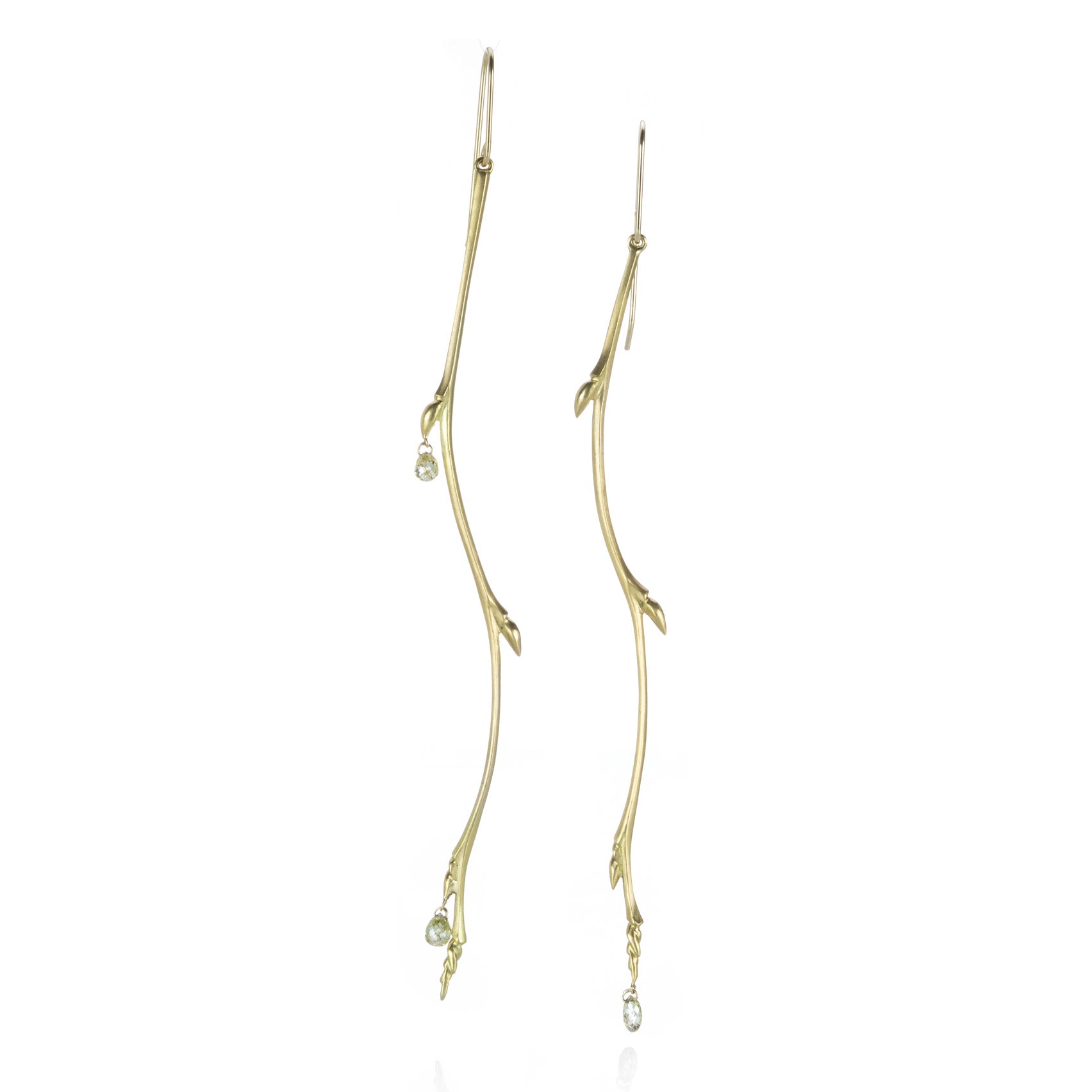 Honor the beauty found in nature with an expression only Gabriella Kiss can create! This pair of 18k yellow gold asymmetrical branch earrings bears diamond drop briolettes, perhaps from a recent rain or maybe the morning dew. Total length with 14k yellow gold curved ear wires measures approximately 4". Handcrafted in Hudson Valley, NY, U.S.