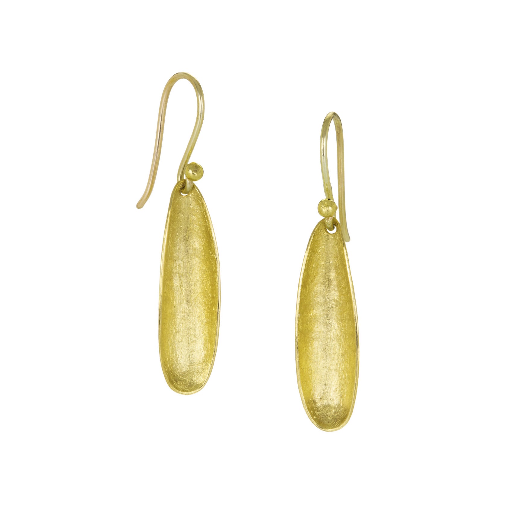 Bring a healthy drop of golden glow to any look in this pair of 22k yellow gold earrings from Petra Class. Concave organic brushed pods hang from 18k yellow gold ear wires. Total length measures 1 3/8". Handcrafted in San Francisco, CA, U.S.