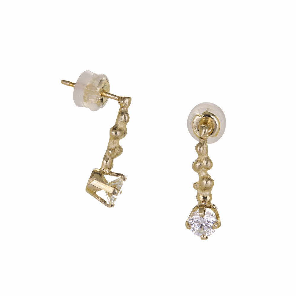 An elegant twist on traditional studs, this pair of 14k yellow gold earrings from Robin Haley adds a drop of sparkle with a hint of golden glow. Prong set 4mm white diamonds totaling 0.46cttw are held on stationary, posted curved bars with bubble detailing. Total length measures just over 1/2". Handcrafted in Nashville, TN, U.S.