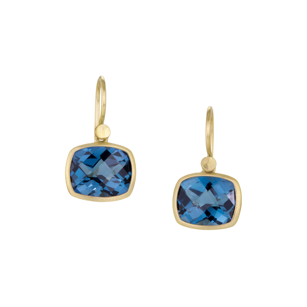 Rock and roll begins with the blues! This pair of 18k yellow gold earrings from Lola Brooks brightens any outlook with faceted cushion London blue topaz drops totaling 9.10cttw. Set in satiny brushed 18k yellow gold bezels and hanging from dot detailed ear wires, the total length measures 3/4”. Handcrafted in Lexington, GA, U.S.