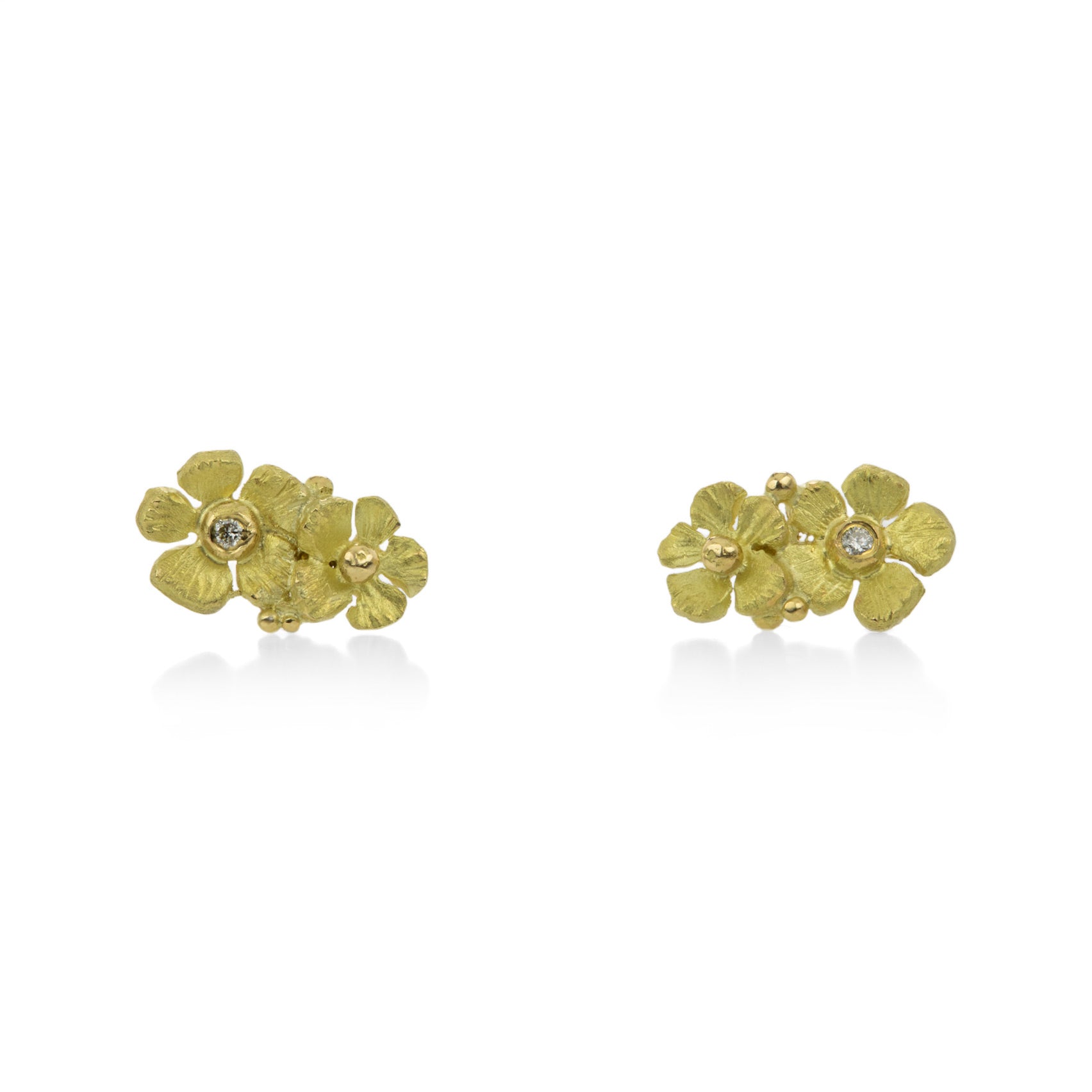 Fancy up your lobes in this fun, flirty pair of 18k yellow gold studs from Lene Vibe! Double floral blooms sparkle to the garden party with dewy white diamonds totaling 0.02cttw. Studs measure approximately 1/4" x 3/8". Handcrafted in Denmark.