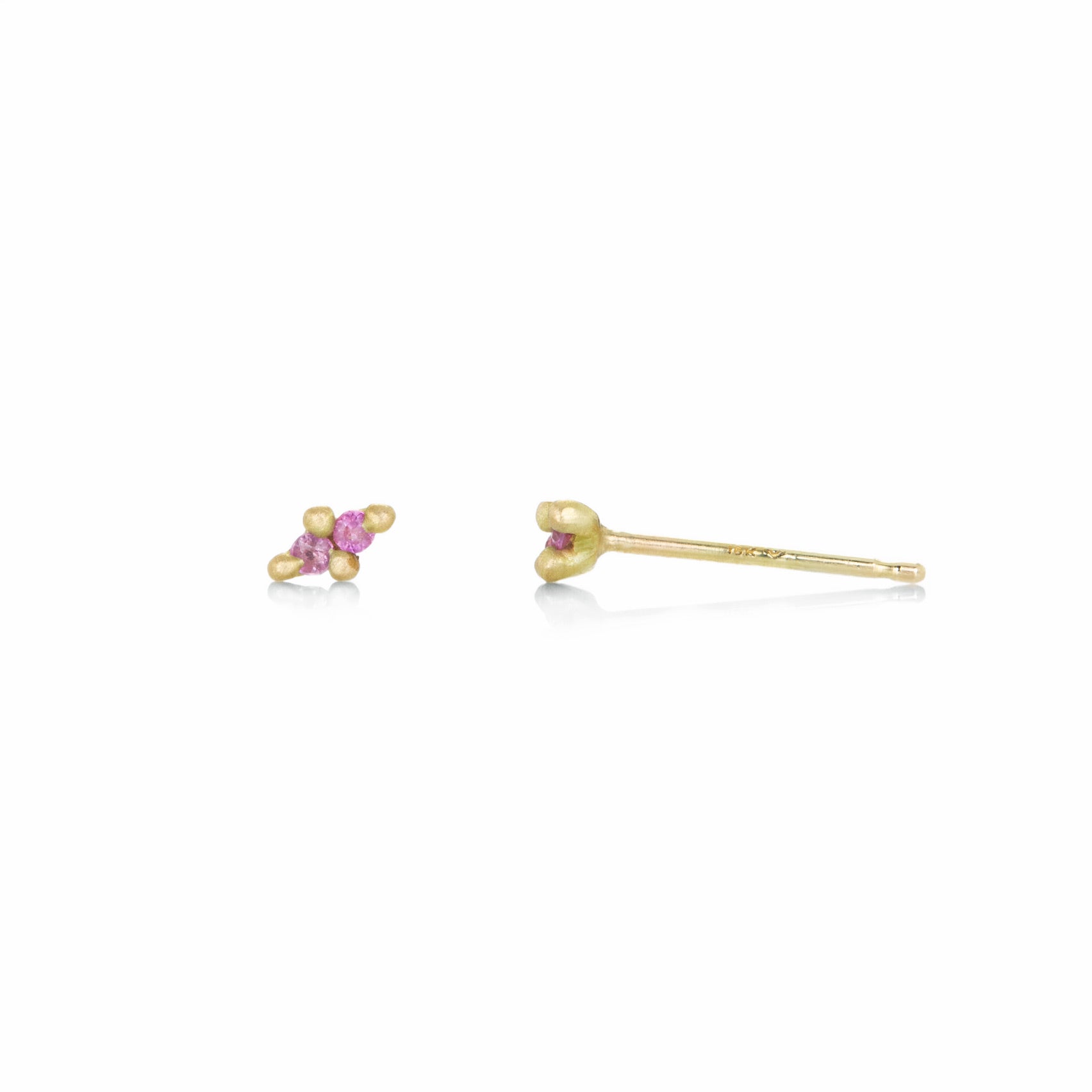 Follow the magic in this pair of 18k yellow gold studs from Marian Maurer. Simple prong settings hold duos of twinkling 1.5mm pink sapphires. Studs measure just under 1/4". Handcrafted in Brooklyn, NY, U.S.