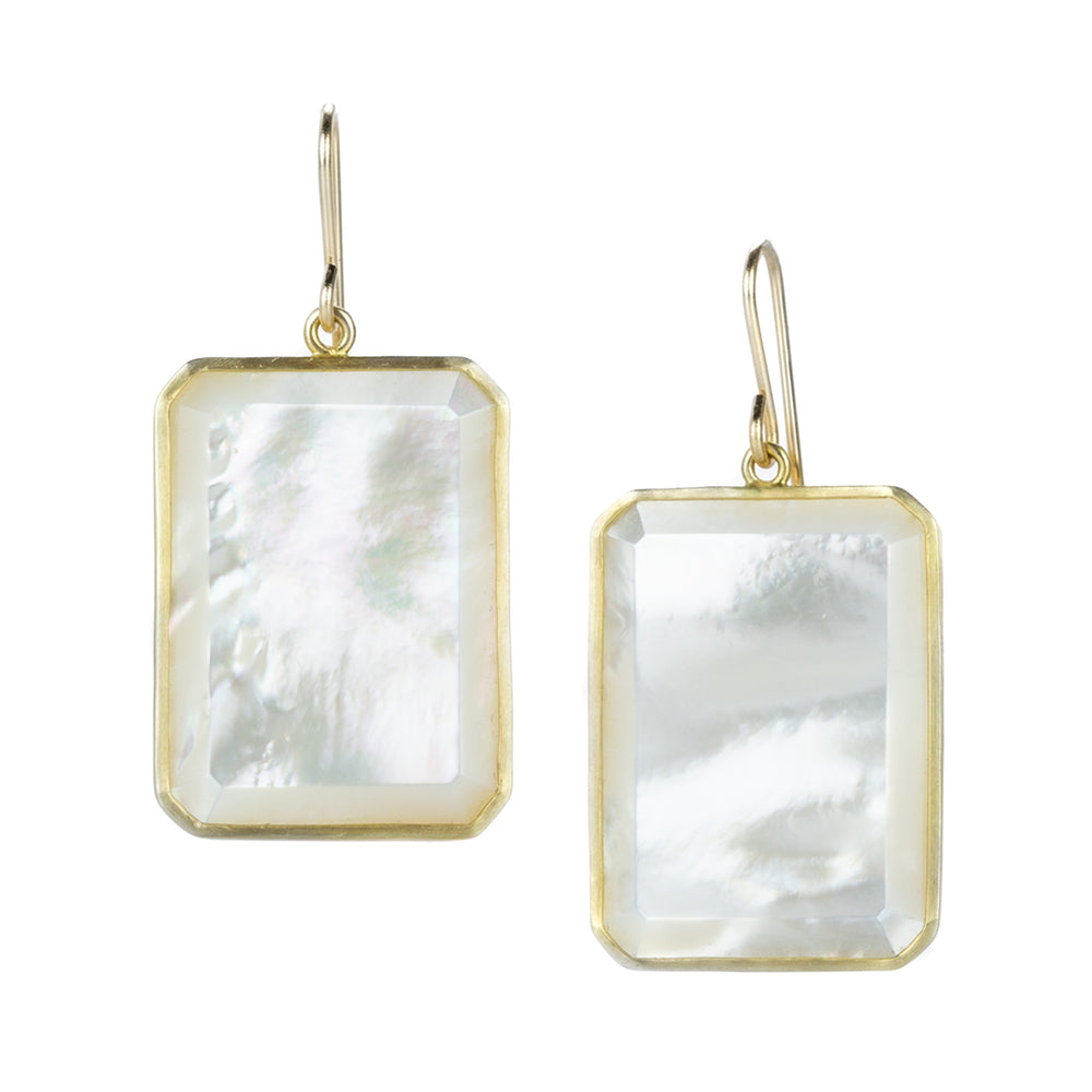 Make a bold, brilliant statement of elegance in this pair of 18k yellow gold earrings from Maria Beaulieu, featuring large emerald cut mother of pearl drops. The 19mm x 25mm stones are set in minimalist bezels that truly allow the light to work its magic. Total length with curved ear wires measures 1 1/2". Handcrafted in Brooklyn, NY, U.S.