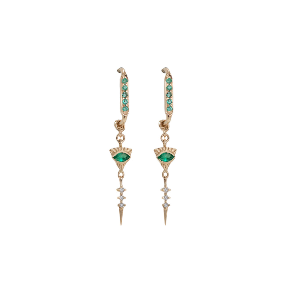 Wear a set of eyes like daggers in this pair of 14k yellow gold earrings from Celine Daoust. Round and marquise shaped emeralds totaling 0.16cttw with white diamonds totaling 0.03cttw highlight this thin, edgy design. Total length measures just under 1 1/4“. Handcrafted in Belgium.