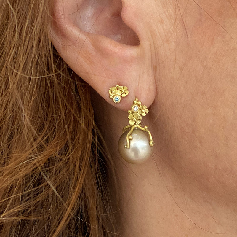Indulge in the exquisite craftsmanship of Lene Vibe with these stunning 18k yellow gold earrings. Adorned with lustrous pink South Sea pearl drops, these elegant earrings feature intricately carved floral caps and sparkling white diamonds. The diamonds, totaling 0.08 carats, are expertly set in bezels, adding a touch of brilliance to the design. These handcrafted earrings are the perfect blend of sophistication and artistry, sure to captivate and enchant. Total length measures 3/4".