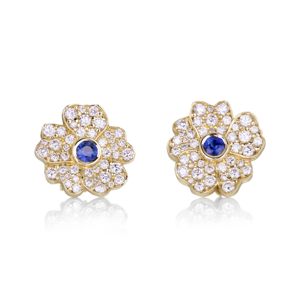Pick a pair of perfect petals in these 14k yellow gold studs from Fannie Thomas. Hand carved and cast flowers feature pavé diamonds with blue sapphire center stones. Earrings measure 1/2" in diameter. Handcrafted in San Antonio, TX, U.S.