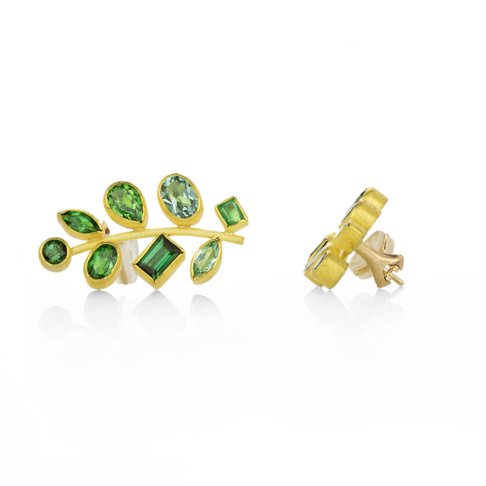 Take a sweet, juicy bite out of life in this sumptuous pair of posted stud earrings from Petra Class. 22k yellow gold bezel set green tourmalines of various shapes and sizes gracefully climb the vine. With 18k yellow gold posts, earrings measure just under 1 1/4“ x 5/8“. Handcrafted in San Francisco, CA, U.S.