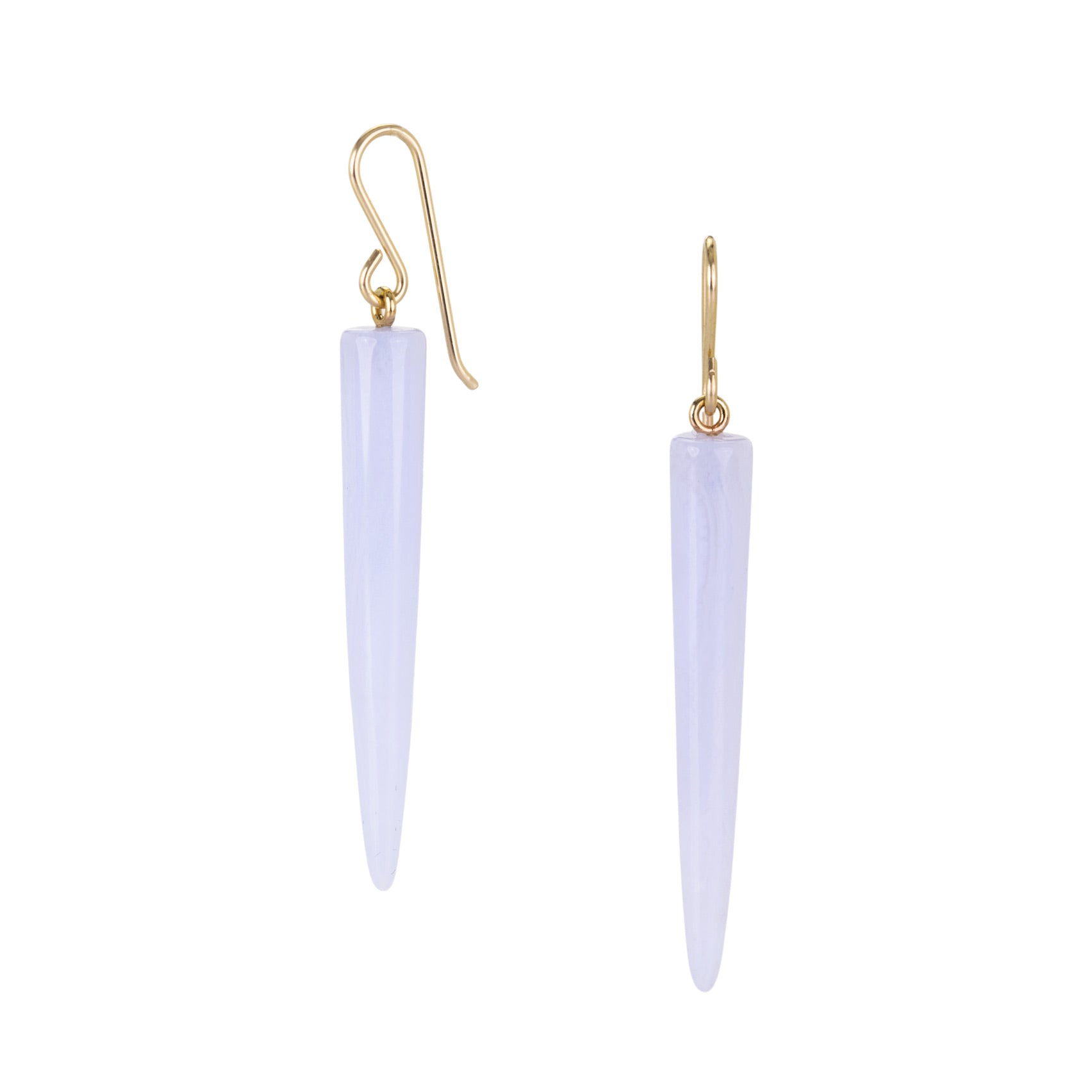 Illuminate your lobes with edgy pale blue in this pair of 18k yellow gold drop earrings from Maria Beaulieu! Smooth elongated cone shaped blue lace agate are cool to the eye and touch. Total length with 18k yellow gold ear wires measures 1 7/8“. Handcrafted in Brooklyn, NY, U.S.