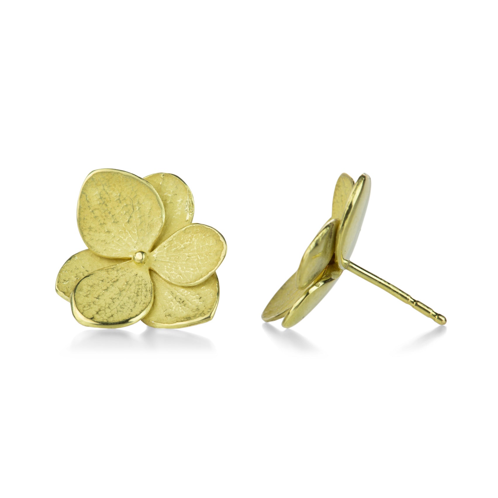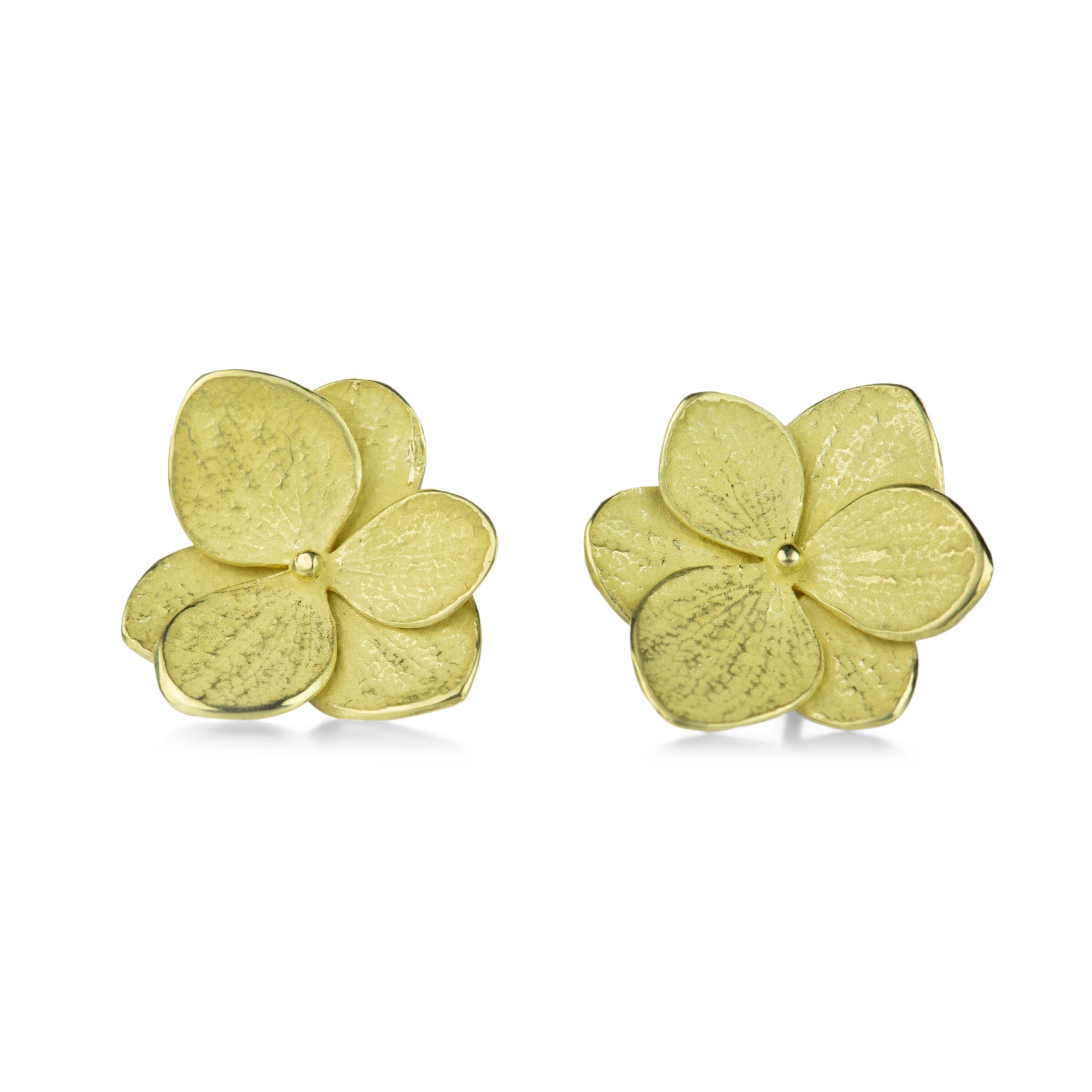 These naturally beautiful John Iversen hydrangea earrings are a longtime Quadrum favorite. This design features an artful rendition of nature cast bright 18k yellow gold hydrangea blossoms, a tiny bouquet that will never wilt and can be treasured forever! Studs measure 3/4" in diameter with 18k yellow gold posts. Handcrafted in East Hampton, NY, U.S.