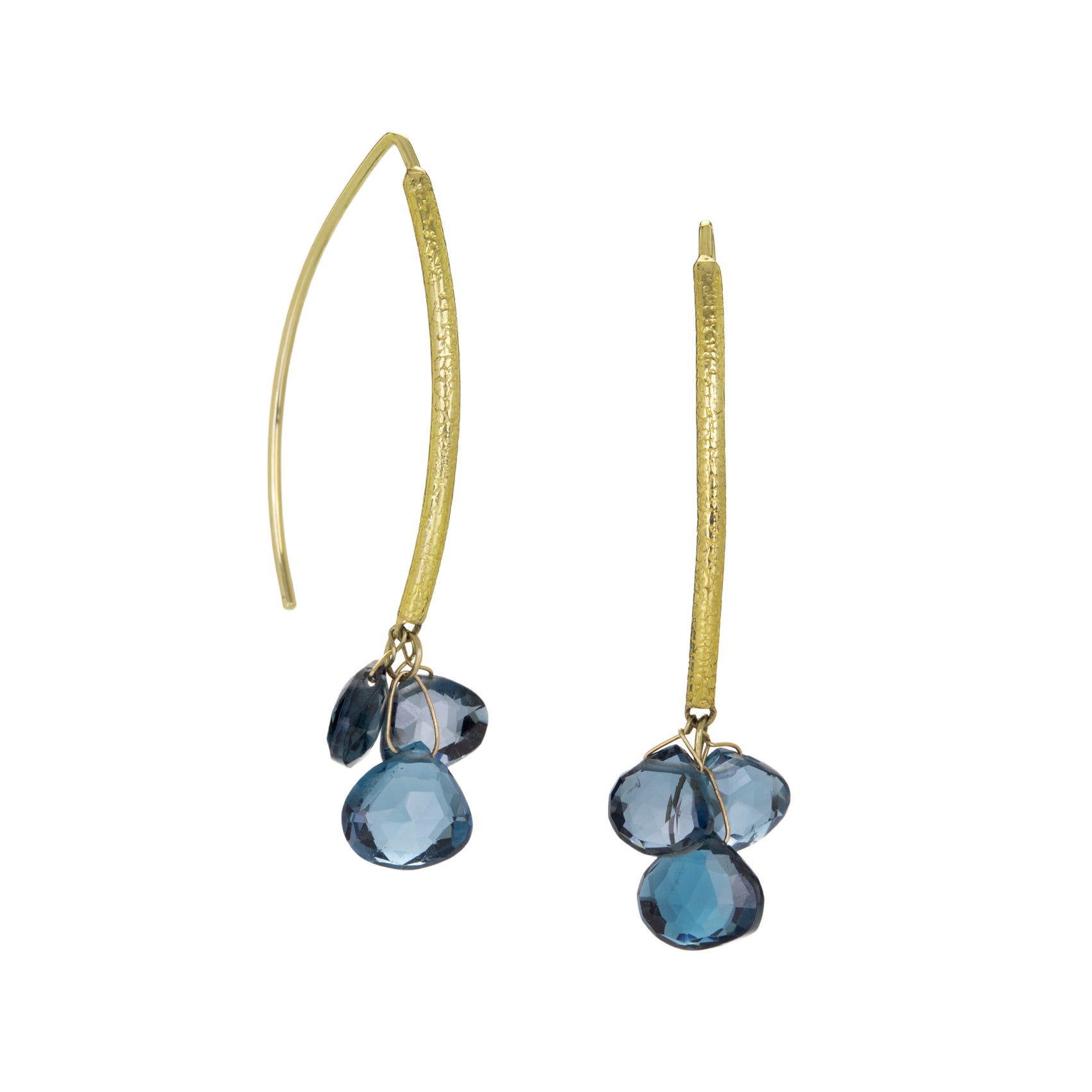 This pair of Barbara Heinrich gemstone earrings features a dramatic navette form and vibrant, passionate color. Crafted in textured 18k yellow gold, an elongated wire holds faceted London blue topaz briolette drops totaling 7.34cttw. Just the right dash of sparkle to keep the flame alive! Total length measures 1 1/2“. Handcrafted in Rochester, NY, U.S.