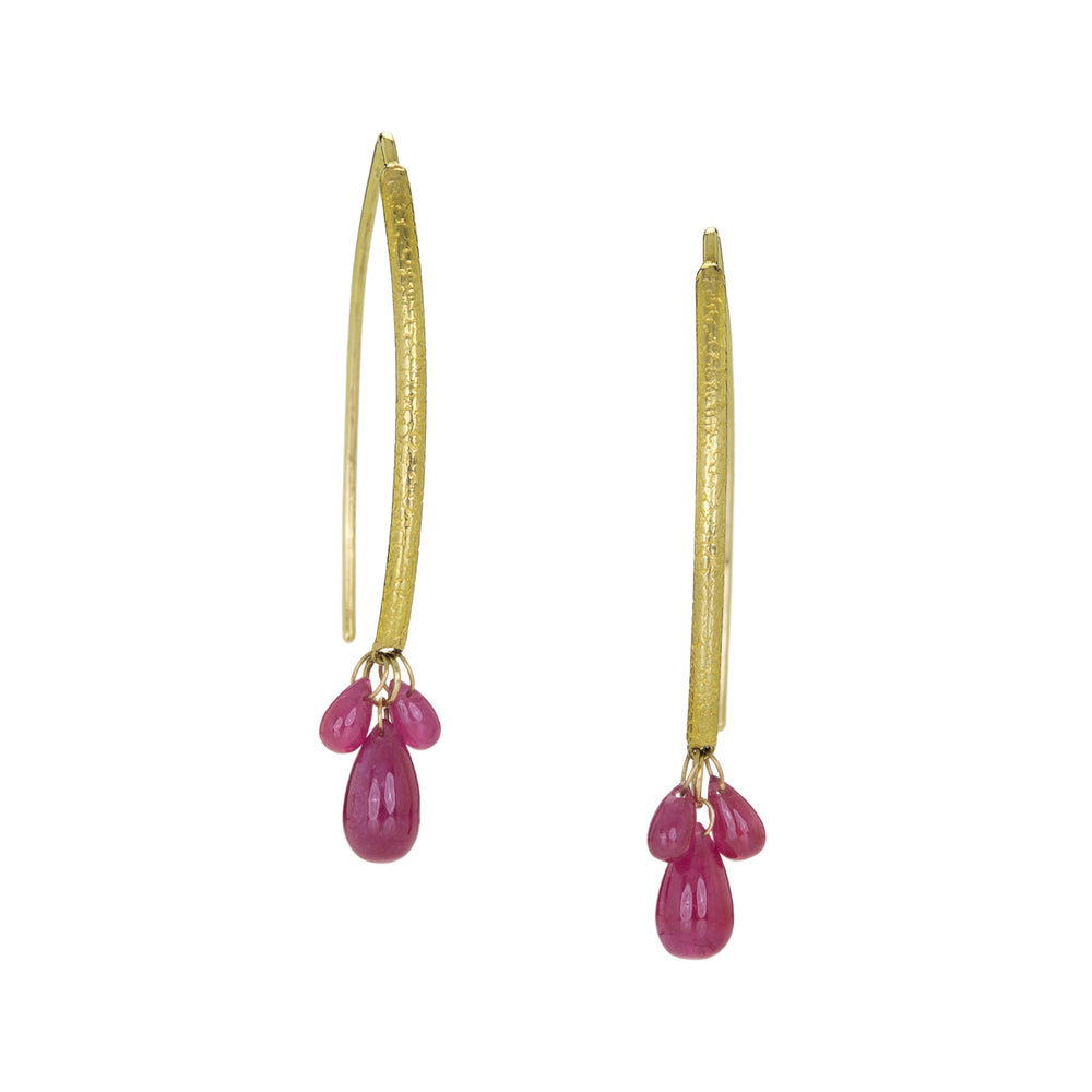 This pair of Barbara Heinrich gemstone earrings features a dramatic navette form and vibrant, passionate color. Crafted in textured 18k yellow gold, an elongated wire holds faceted ruby briolette drops totaling 3.50cttw. Just the right dash of sparkle to keep the flame alive! Total length measures 1 1/2". Handcrafted in Rochester, NY, U.S.