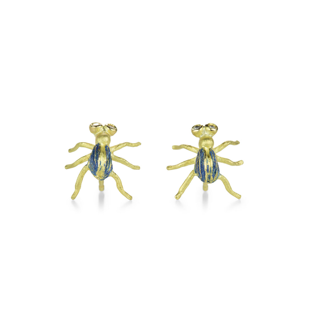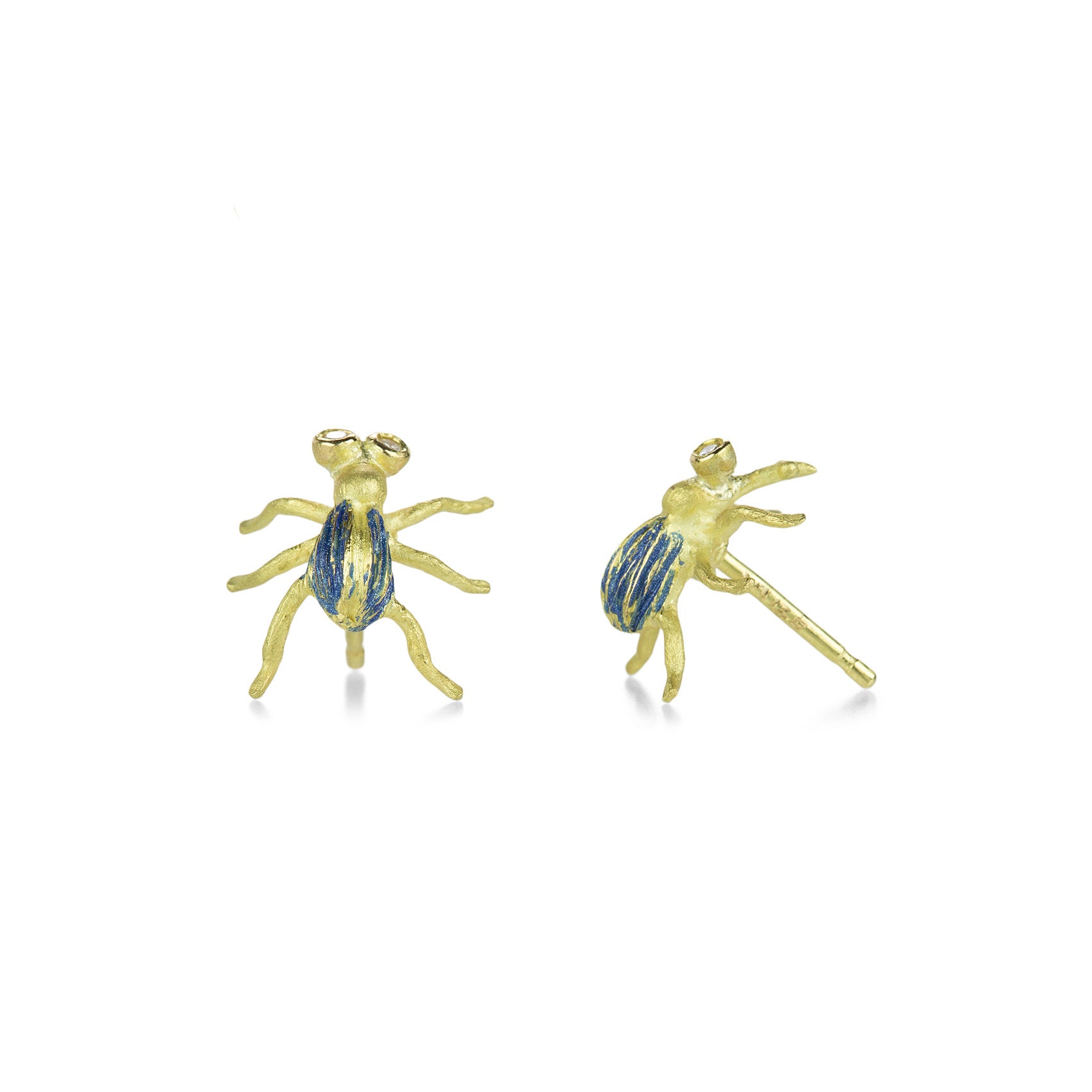 Add a dash of golden whimsy to your daily menu in this pair of 18k yellow gold studs from Lene Vibe. Adorable 0.04cttw diamond-eyed beetles with navy blue enamel wings will positively make your day! Studs measure 1/2" x 1/2". Handcrafted in Denmark.