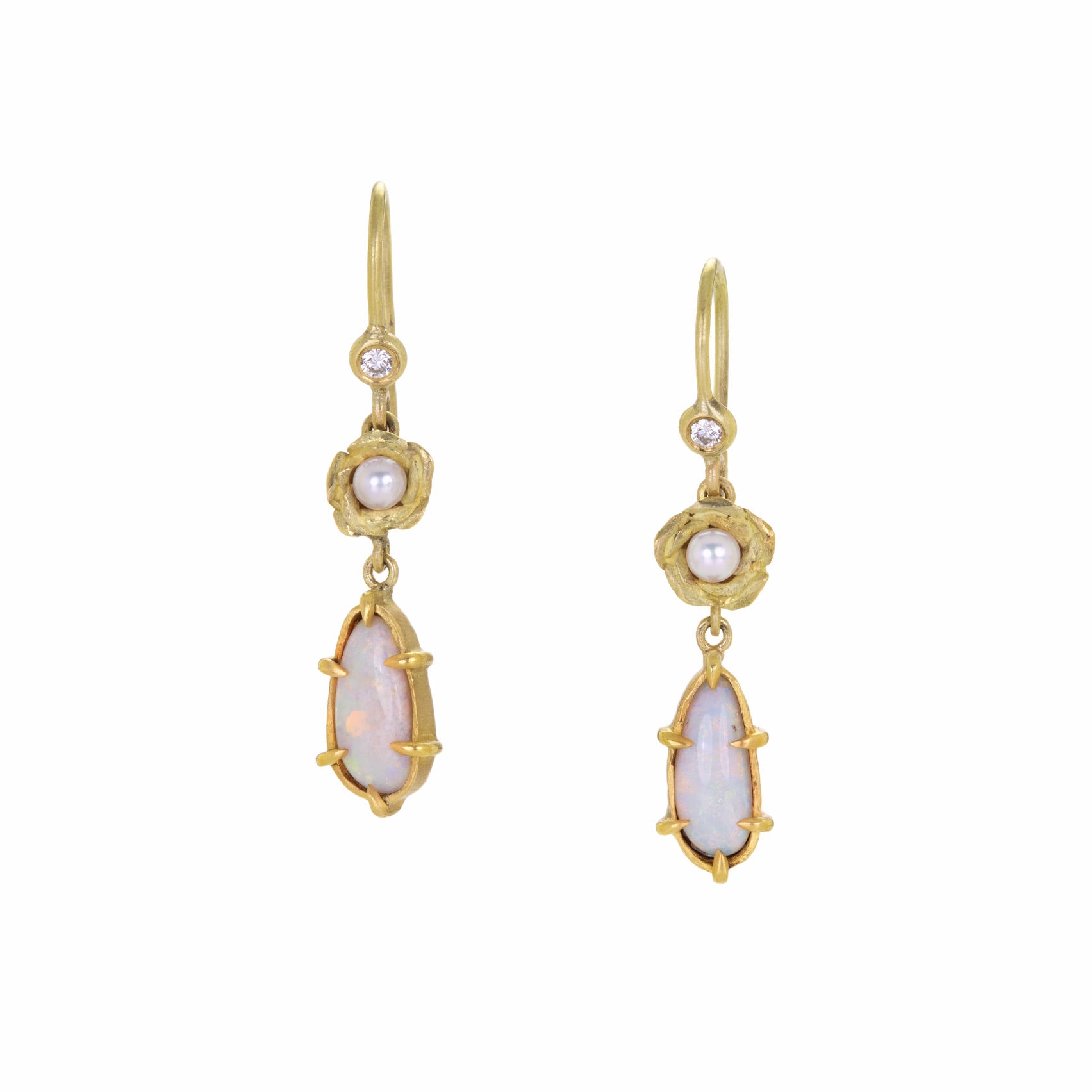 Set fire to your soul in this pair of 22k and 18k yellow gold drop earrings from Annie Fensterstock. Pear shaped white opals are set in pronged bezels, hanging below nested pearls and bezel set diamonds totaling 0.06cttw above. Total length with curved ear wires measures 1 1/4“. Handcrafted in New York, NY, U.S.