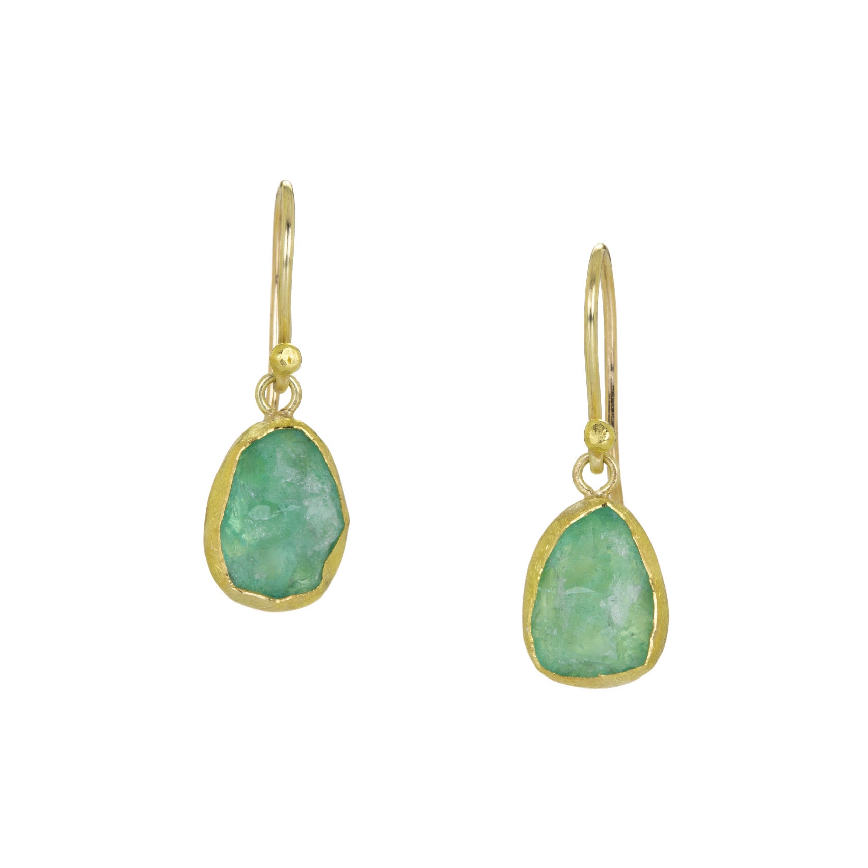Life is not too rough in this pair of 22k and 18k yellow gold earrings from Petra Class. Embrace the raw beauty of nature with bezel set, rough cut emeralds. Total length with curved ear wires measures 1”. Handcrafted in San Francisco, CA, U.S.