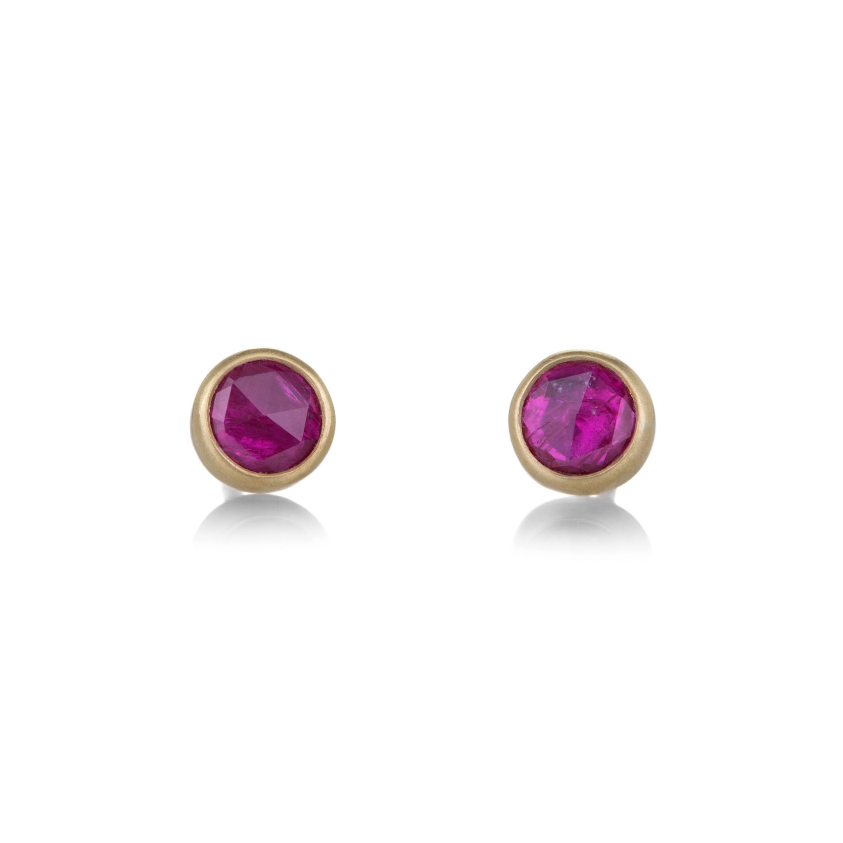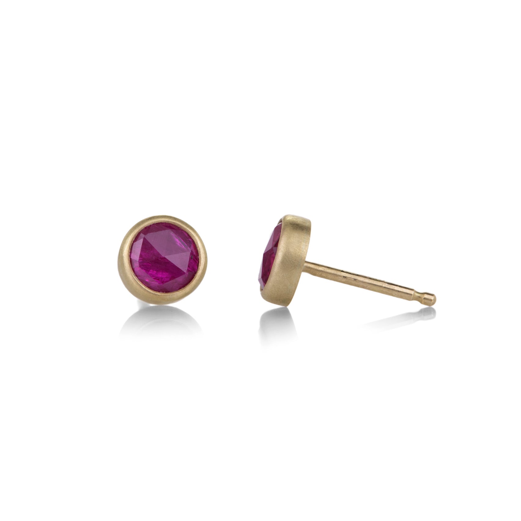 Let bright, fresh color be your new staple accessory in this pair of 18k yellow gold gemstone studs from Lola Brooks. Round rose cut Mozambique rubies totaling 0.71cttw shine in their minimalist brushed bezel settings. Studs measure approximately 1/4" in diameter. Handcrafted in Lexington, GA, U.S.