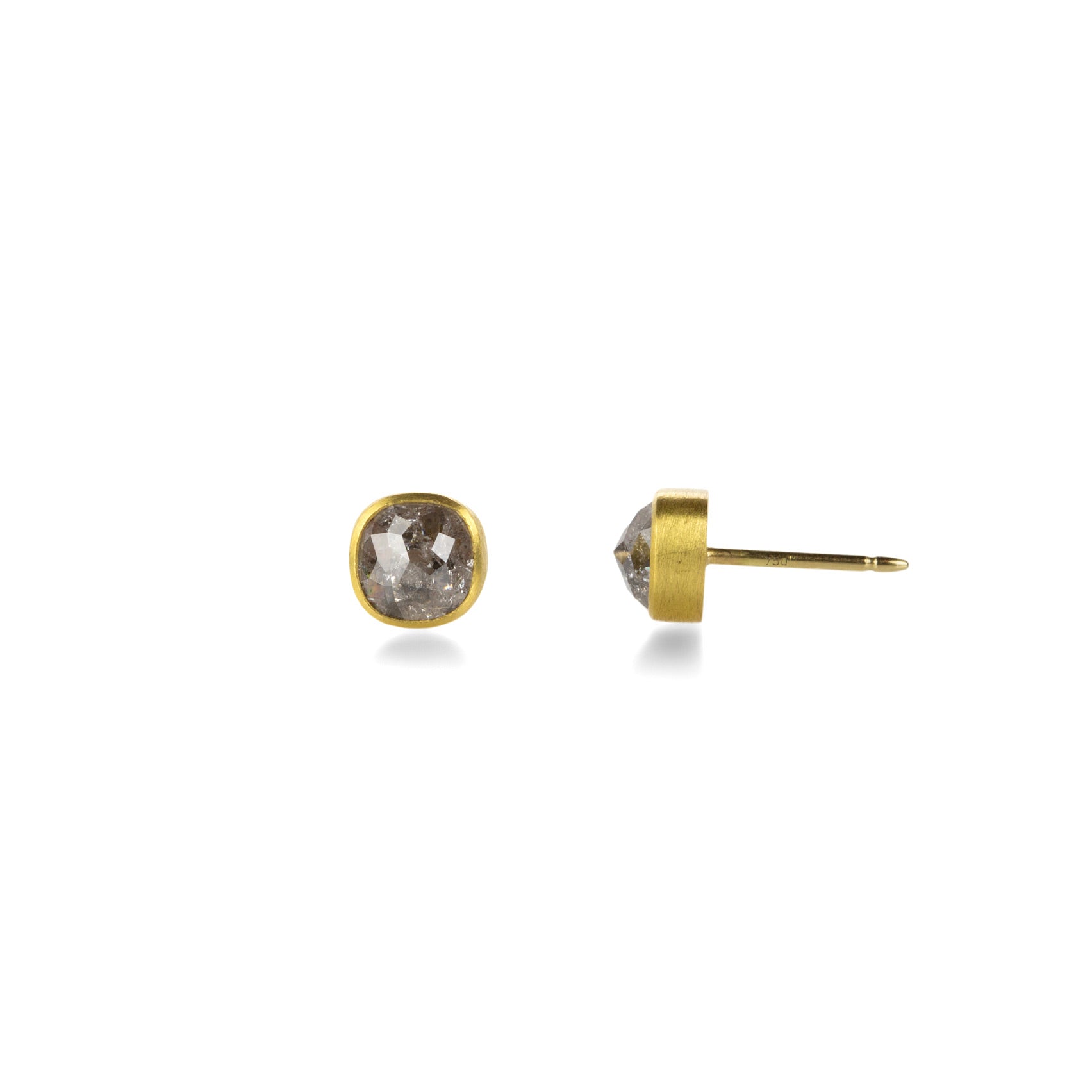 Tempt your tastebuds with some fire and spice in this pair of 22k and 18k studs from Mallary Marks, featuring bezel set 5.5mm rose cut, cushion shaped salt and pepper diamonds totaling 1.55ctw. Studs measure 1/4”. Handcrafted in New York, NY, U.S.