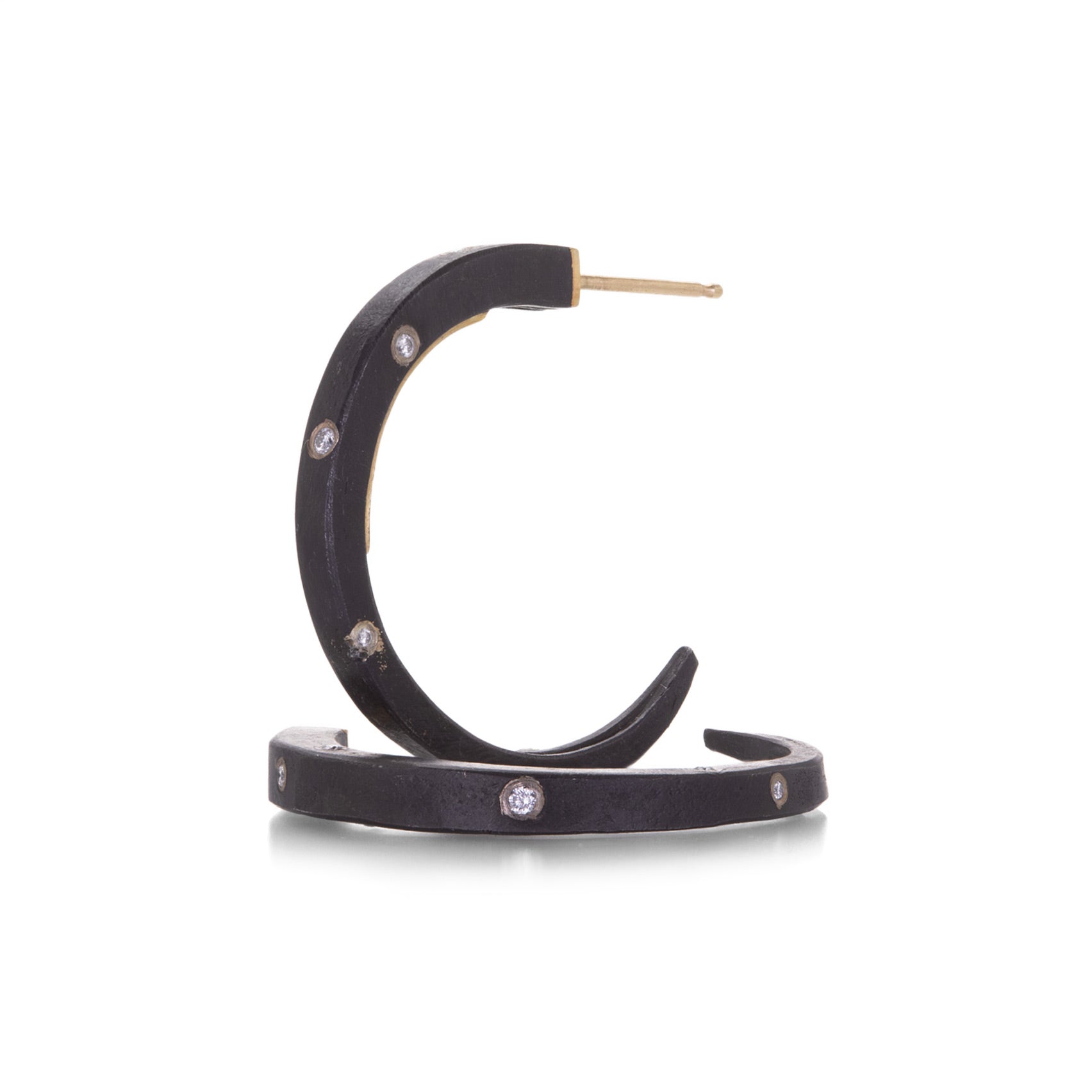 An elegant and simple design, this pair of hand forged iron hoops from Pat Flynn are a distinctive variation from the norm. With an 18k yellow gold post and diamonds sprinkled throughout the surface, picture yourself in these stylish black and gold beauties. Hoops measure 1" in diameter. Handcrafted in High Falls, NY, U.S.