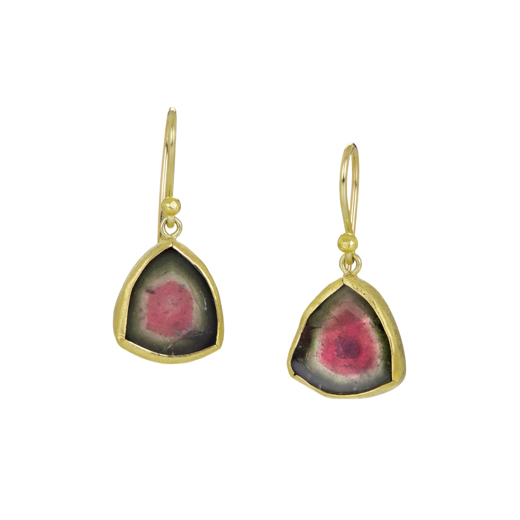 Celebrate the sweetest treat in the gemstone world with this pair of 18k and 22k yellow gold earrings from Petra Class. Organic triangular shaped watermelon tourmalines are set in brushed bezels and beam with lively personality. Total length with curved ear wires measures 1". Handcrafted in San Francisco, CA, U.S.