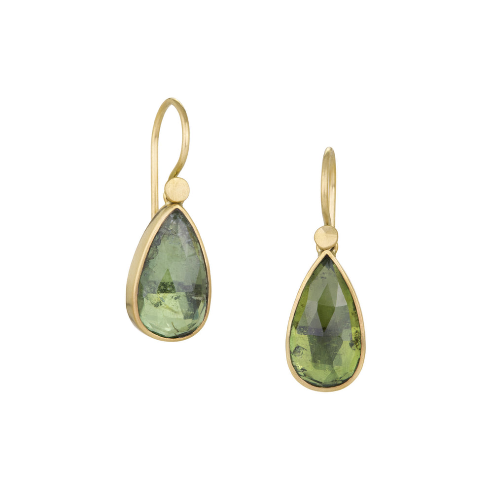 Calling all forest faeries! This pair of 18k yellow gold earrings from Lola Brooks brightens any outlook with teardrop faceted green tourmaline drops totaling 8.04cttw. Set in satiny brushed 18k yellow gold bezels and hanging from dot detailed ear wires, the total length measures 1”. Handcrafted in Lexington, GA, U.S.