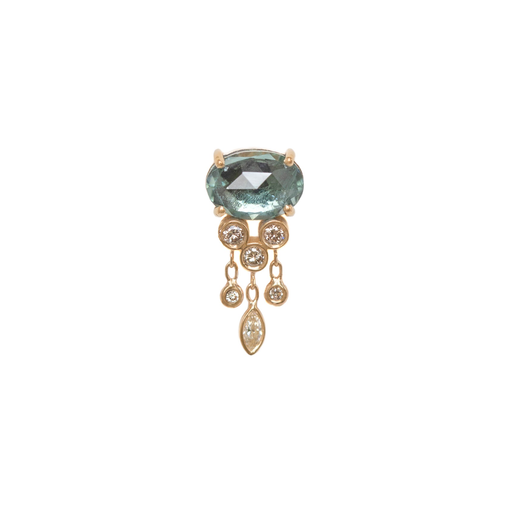 Glow with the flow in this single, 14k yellow gold earring from Celine Daoust. A faceted oval blue-green tourmaline is set in prongs with bezel set diamond dangles. Total length measures 5/8". Single stud only. Handcrafted in Belgium.